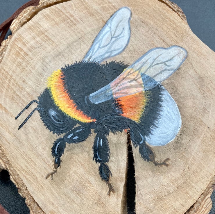 Buzzzzzz ! Hand-painted on to a reclaimed wood slice this bumble bee would brighten anywhere you chose to place him.