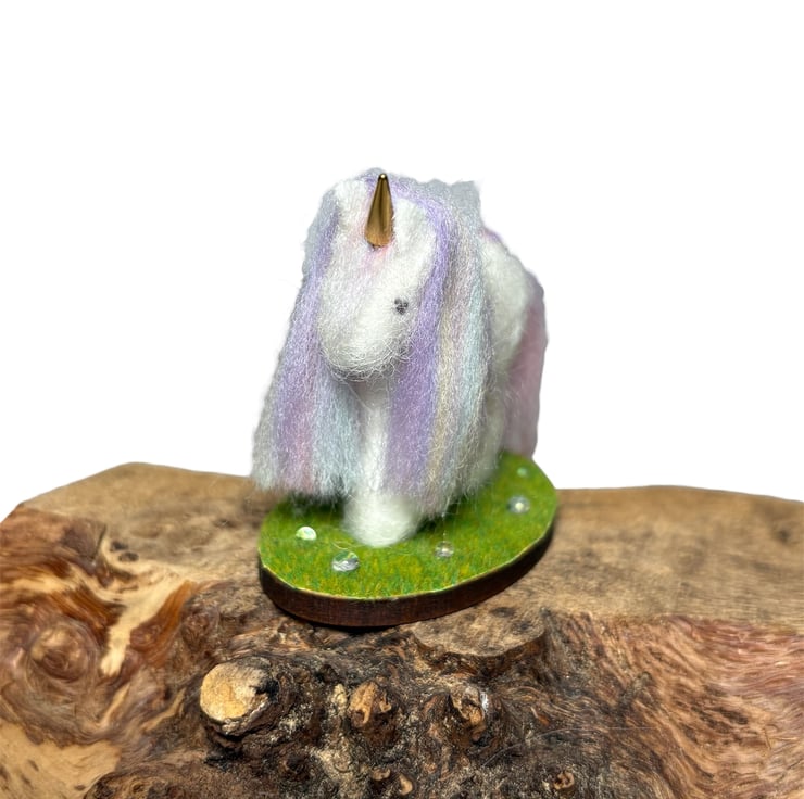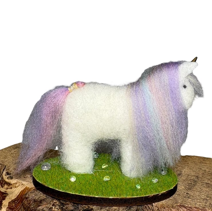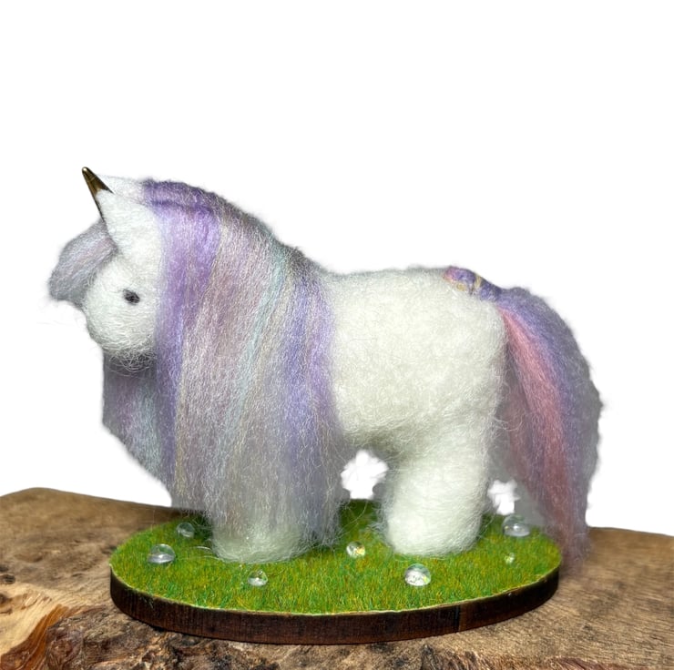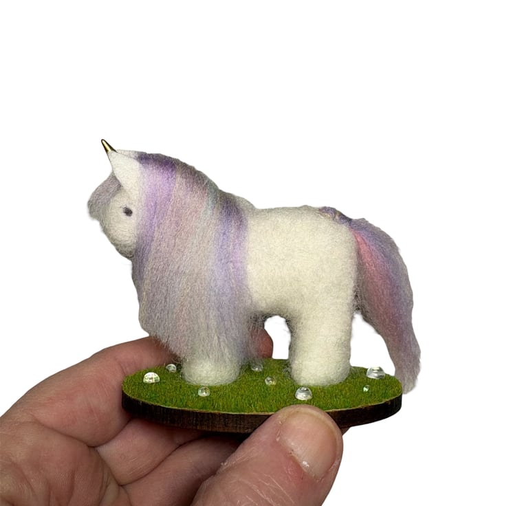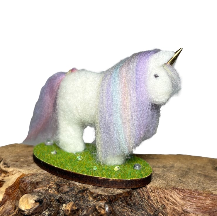 The unicorn is made from wool felt, lightly stuffed and covered in white woollen fibres that have been needle felted in place. A multicoloured pastel blend of merino wool has been used for the mane and tail and a golden horn set in place. The unicorn has been mounted on an oval wooden slice covered in artificial grass and clear, sparkling drops added.