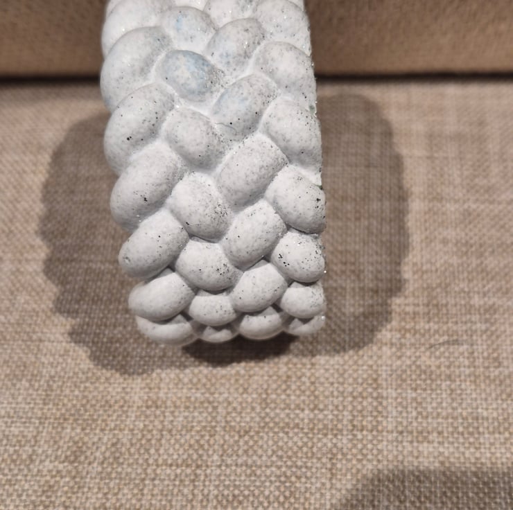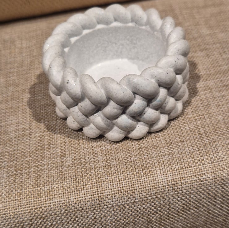 A beautifully handcrafted candle holder made from eco-friendly resin, featuring an elegant braided design around the rim. Its soft speckled finish and neutral tone make it a stylish addition to any home décor, blending perfectly with modern, minimalist, or rustic interiors. Ideal for holding tealights or small candles, it adds a subtle decorative touch to coffee tables, shelves, or dining settings.