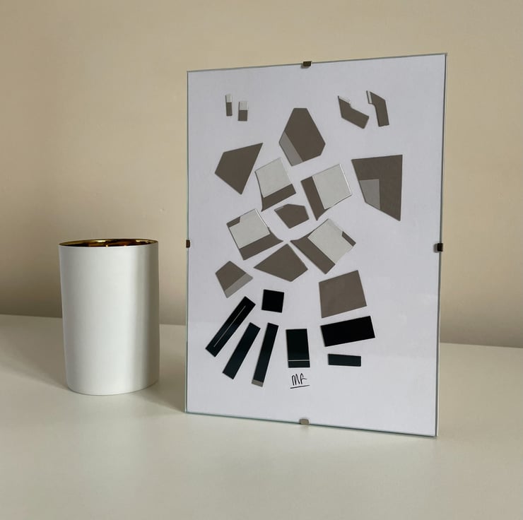 Packaging is plastic free. The collage will be wrapped in tissue paper and a protective sleeve and mailed in a board-backed envelope.