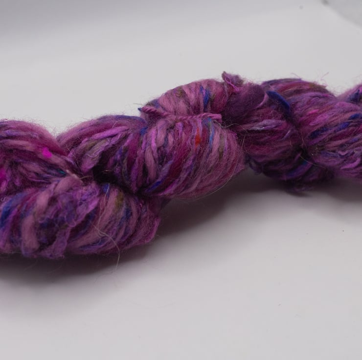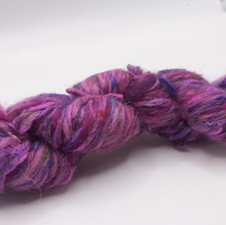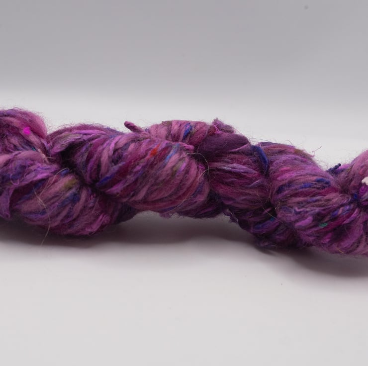 The yarn is spun on a spinning wheel from a batt and plied to create a unique skein and includes recycled sari silk and merino fibre and weighs 9g.