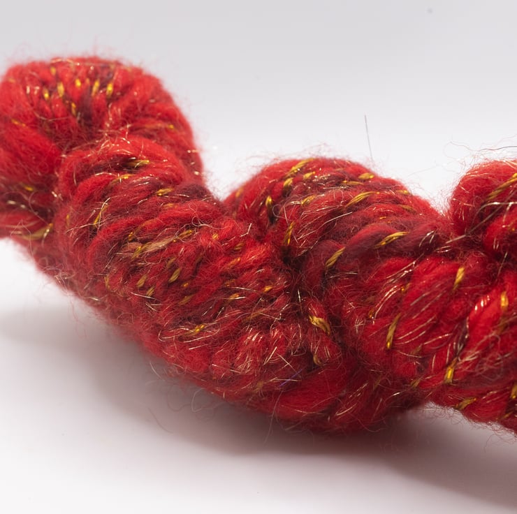 37g Red and gold handspun yarn suitable for weaving, crochet, knitting and other fibre art projects.