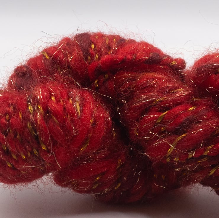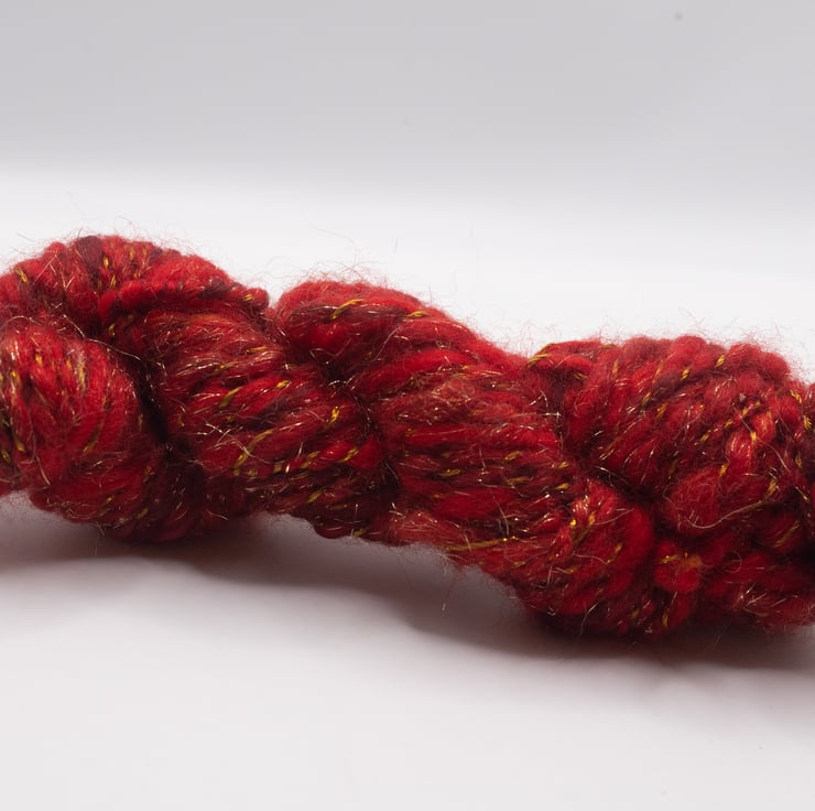 The yarn is spun on a spinning wheel from a batt and plied to create a unique skein. Red merino fibre in combined, spun and plied with gold.
