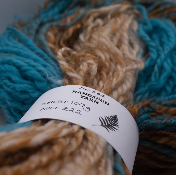 The yarn is spun on a spinning wheel from a batt and plied to create a unique skein and weighs 107g.