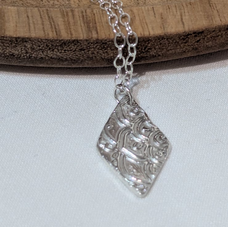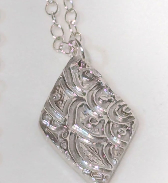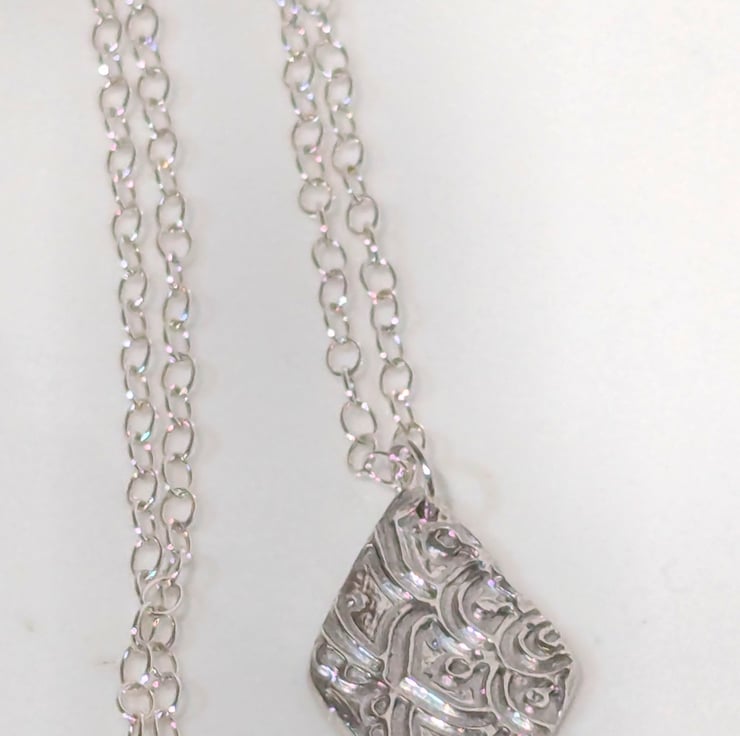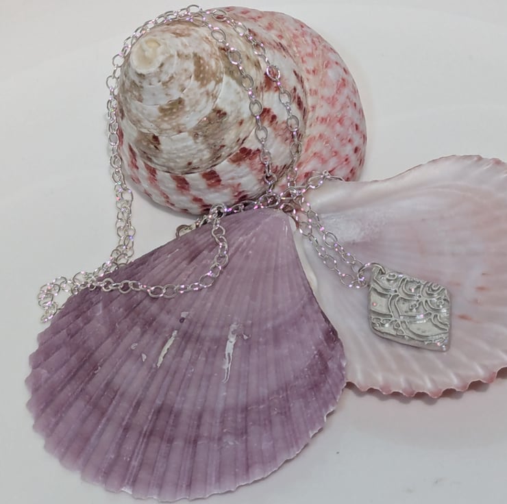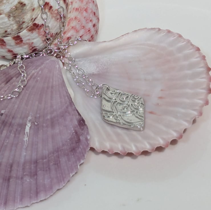 This lovely necklace has a fine silver pendant in a diamond shape, with a vintage lace design on the front. The pendant measures approx. 25 mm (H) x 13 mm (W). The chain and findings are all Sterling Silver.