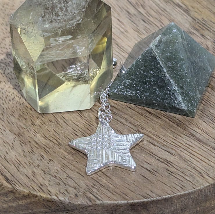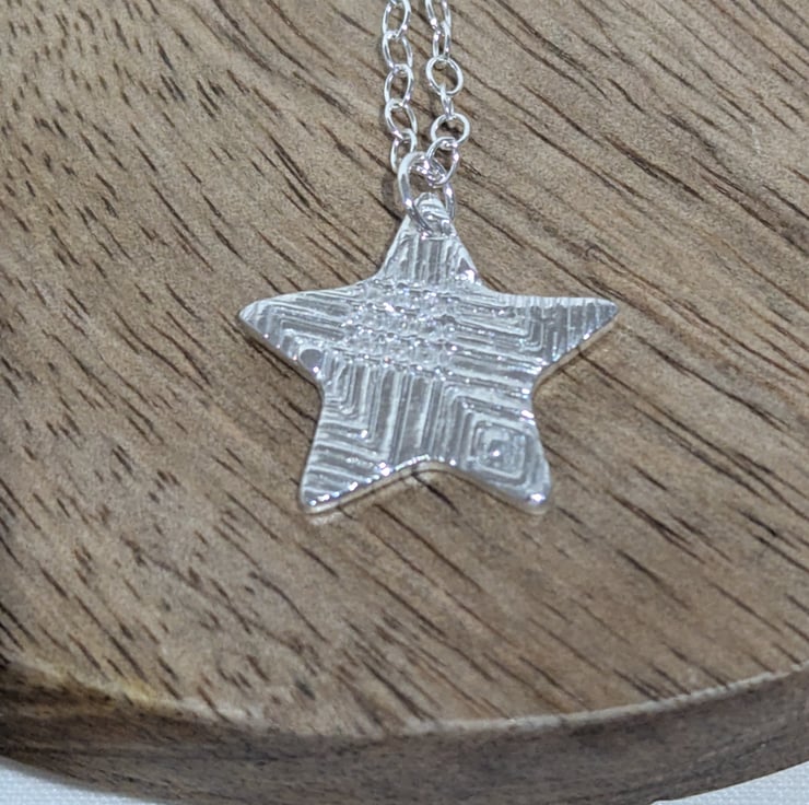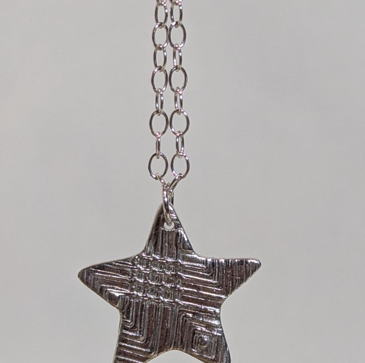 This lovely necklace has a fine silver pendant in the shape of a star, with a geometric pattern on the front. The pendant measures approx. 20 mm (H) x 20 mm (W). The chain and findings are all Sterling Silver.