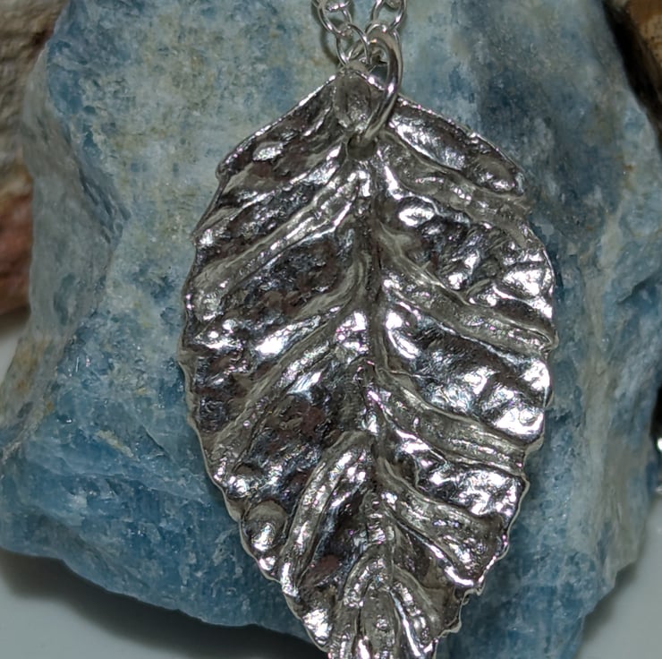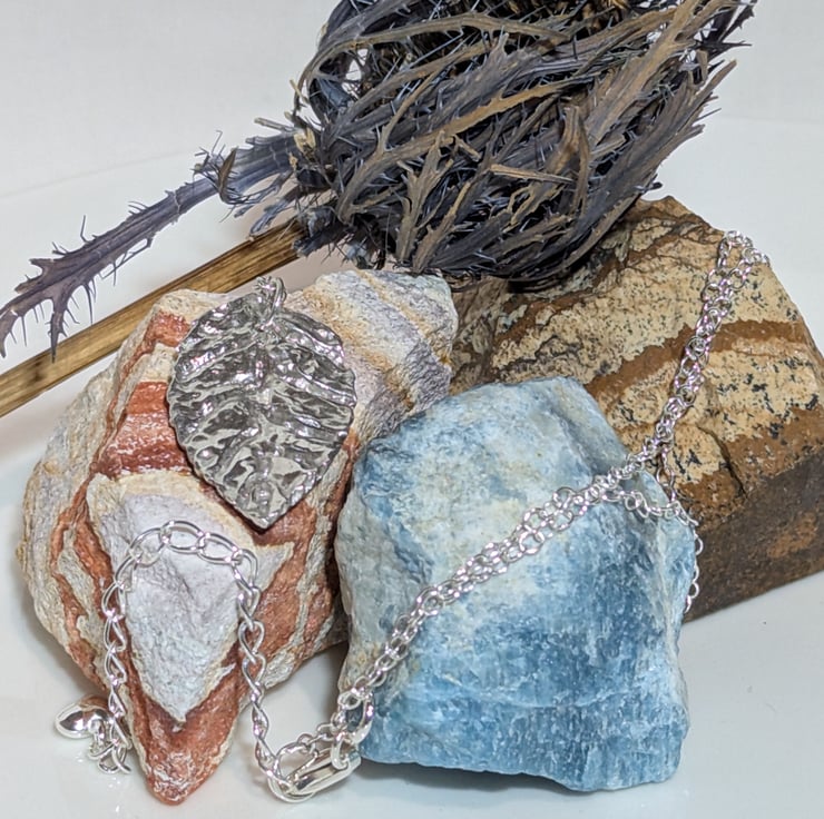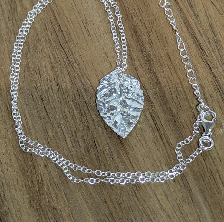 This beautiful necklace has a fine silver leaf pendant. The pendant measures approx. 25 mm (H) x 15 mm (W). The chain and findings are all Sterling Silver.