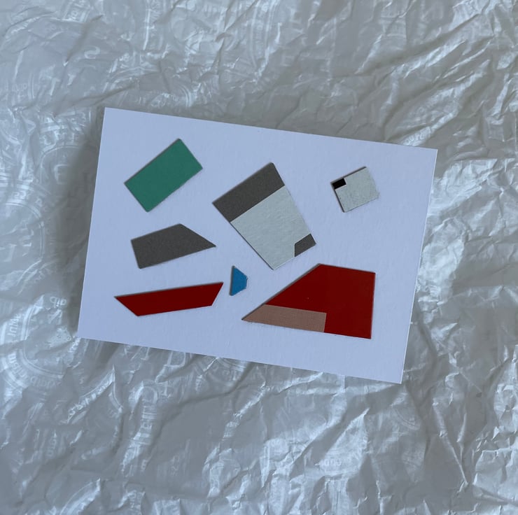 Materials: white card 300gsm; water-based glue; upcycled colour-printed card