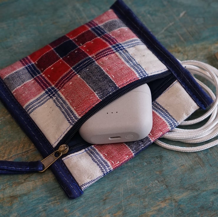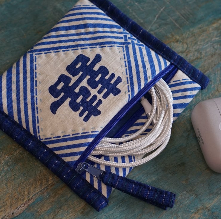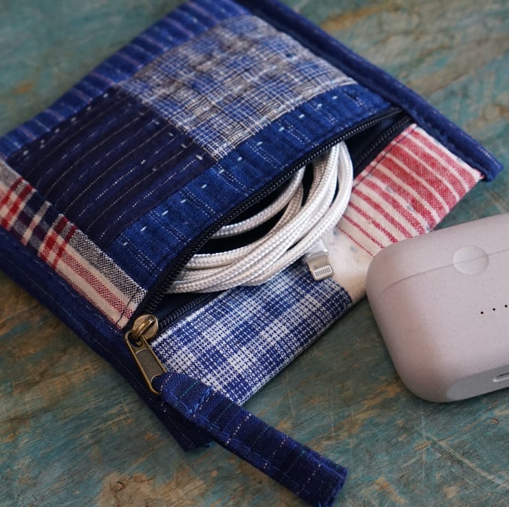 This pouch is made from patchwork of vintage handwoven cotton, naturally dyed in indigo tones and rich in texture. Woven many years ago on traditional wooden looms, the fabrics carrie subtle irregularities that make them uniquely charming.
