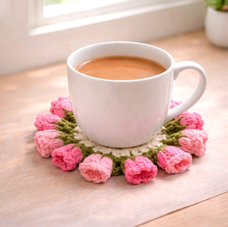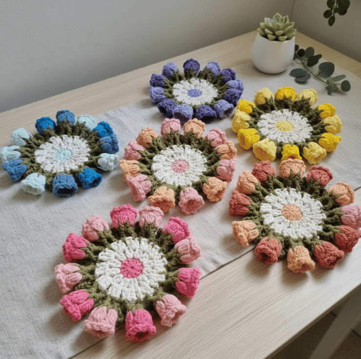I love colourful flowers and cosy tea moments at home. I wanted to create coasters that feel like small crochet flowers on the table, bringing a little colour and joy to everyday life.