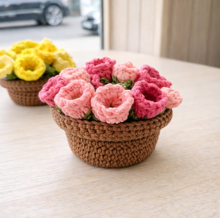 The coasters can be stored in a small handmade pot, creating a lovely crochet flower bouquet when not in use.