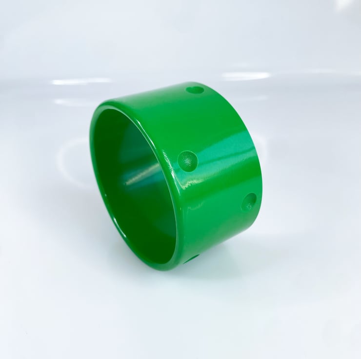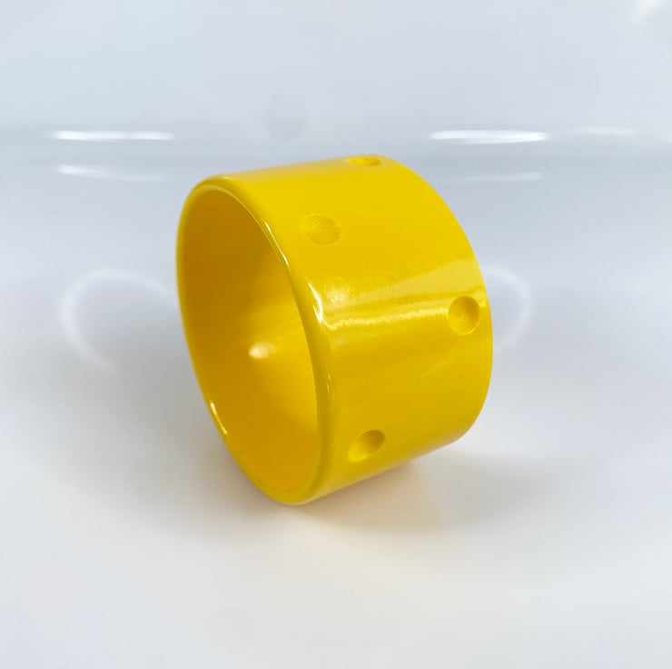 The large "Polka Dots" cuff resin bracelet is the reproduction of a striking 1950's piece. The flat surface is inlaid with debossed dots.