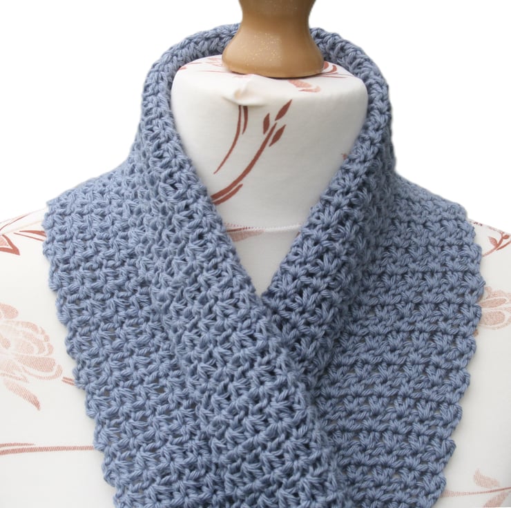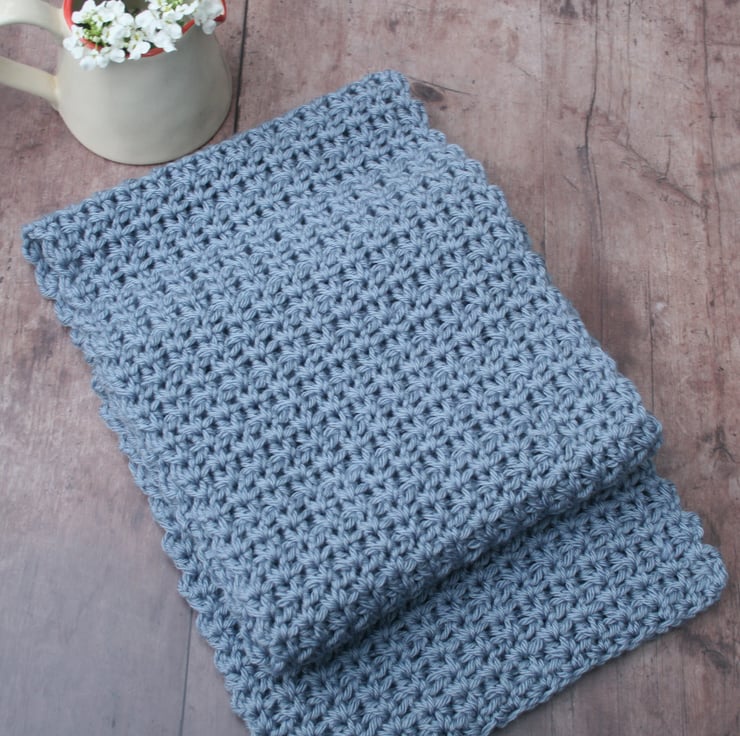 A very soft and gorgeous crocheted scarf, an ideal colour to go with many outfits. It is made from extra soft merino wool, acrylic and ten percent cashmere. Made with care and with the kind permission of the original pattern designer. Whilst I have made every effort to capture the true shade of the scarf, computer monitors do differ. The gorgeous colour can also appear slightly richer or lighter depending on the daylight. The colour is rather sweetly referred to as 'puddle'.