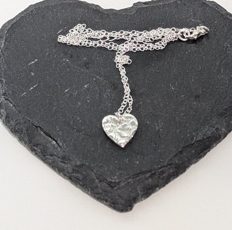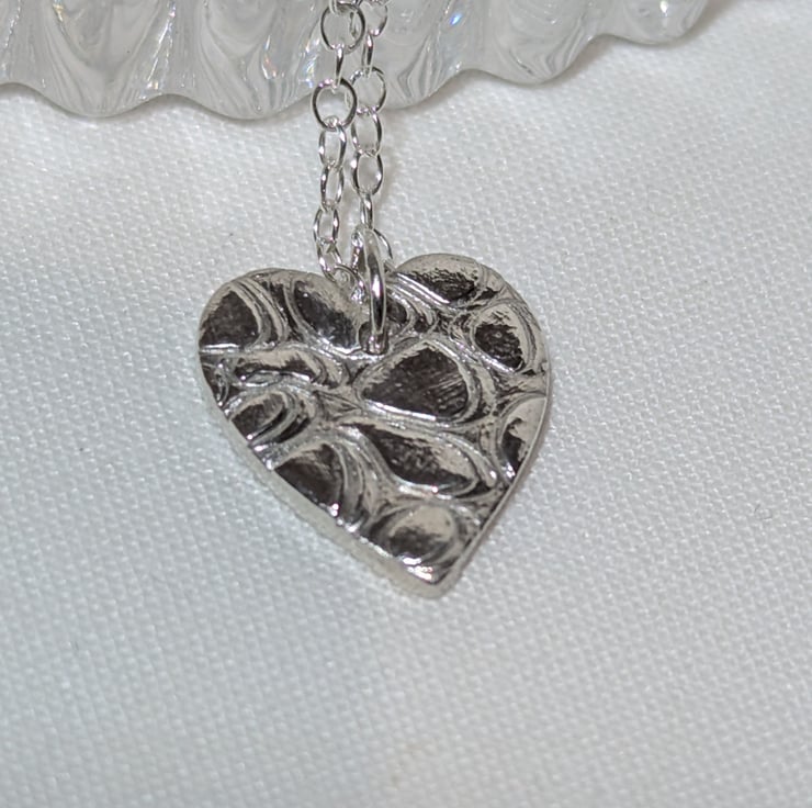 This lovely necklace has a fine silver heart shaped pendant with a bubble pattern on the front. The pendant measures approx. 15 mm (H) x 12 mm (W). The chain and findings are all sterling silver.
