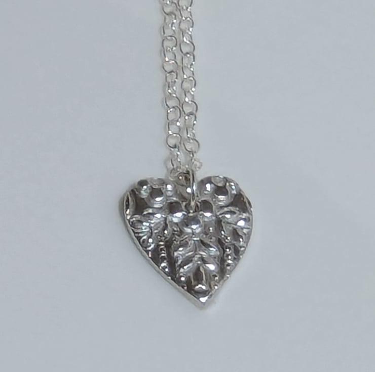 This beautiful necklace has a heart shaped pendant with a vintage floral lace design on the front. The pendant measures approx. 12 mm (H) x 13 mm (W). The chain and findings are all sterling silver.