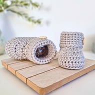 Each pair of newborn booties is handmade to order using soft, baby-safe yarn and presented in a compact gift box, making it perfect for a surprise reveal.
