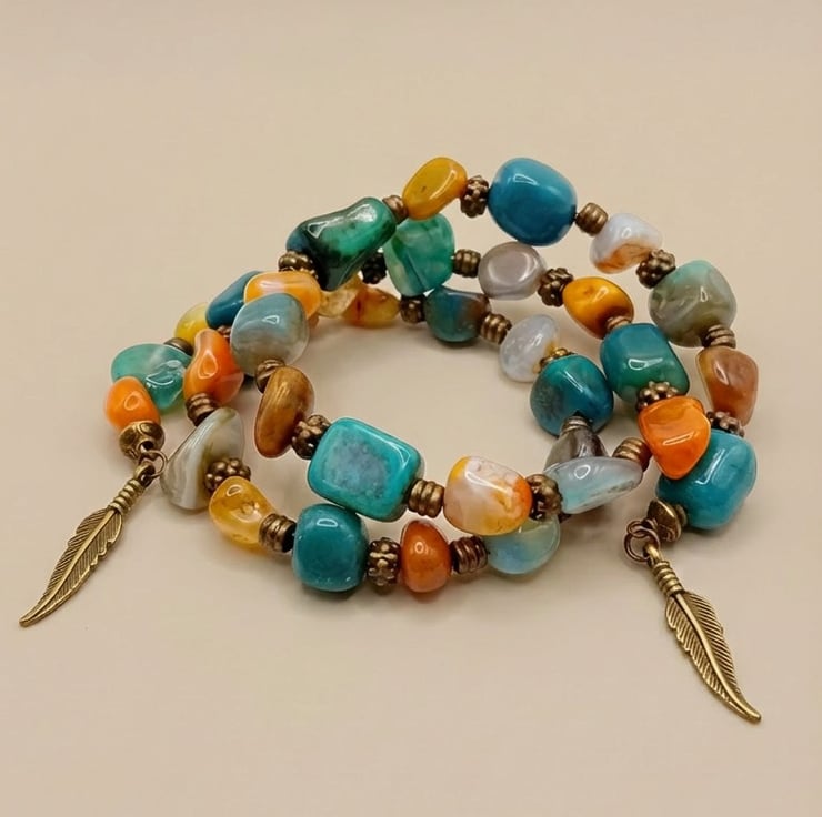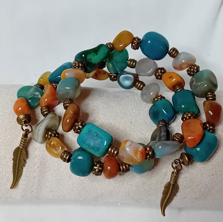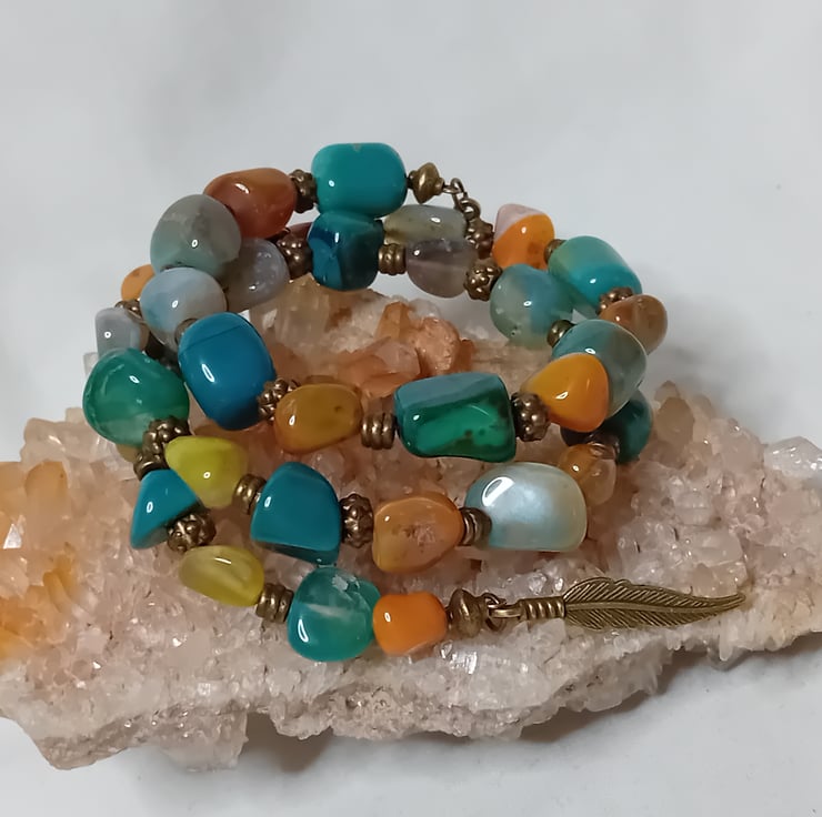 Free form Agate beads measuring 8mm to 12mm with bronze accents makes this bracelet stand out, The base is memory wire so it fits everyone. A lovely free style bracelet that will accent your wardrobe.