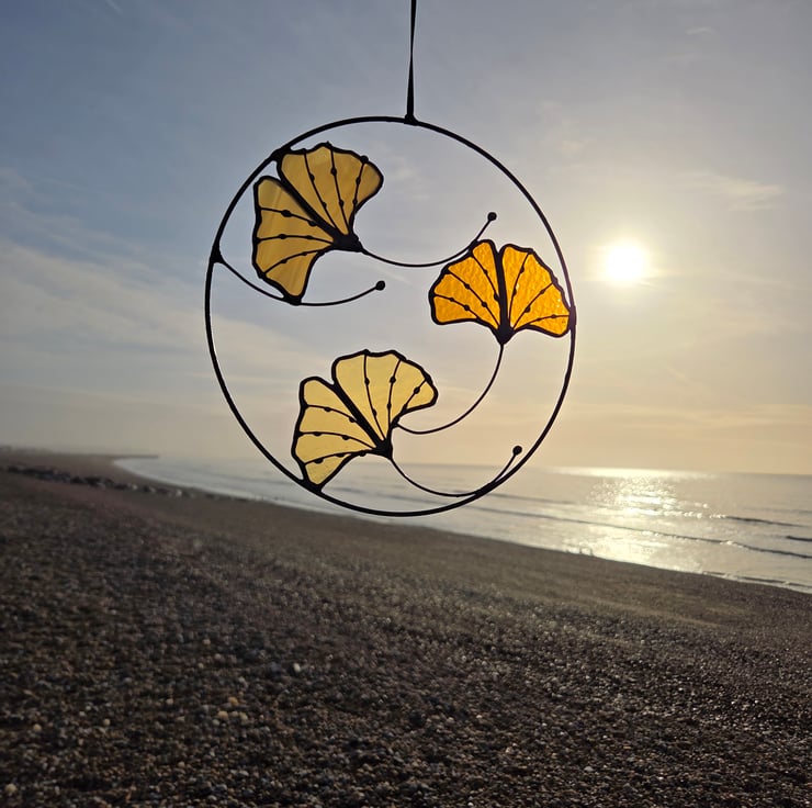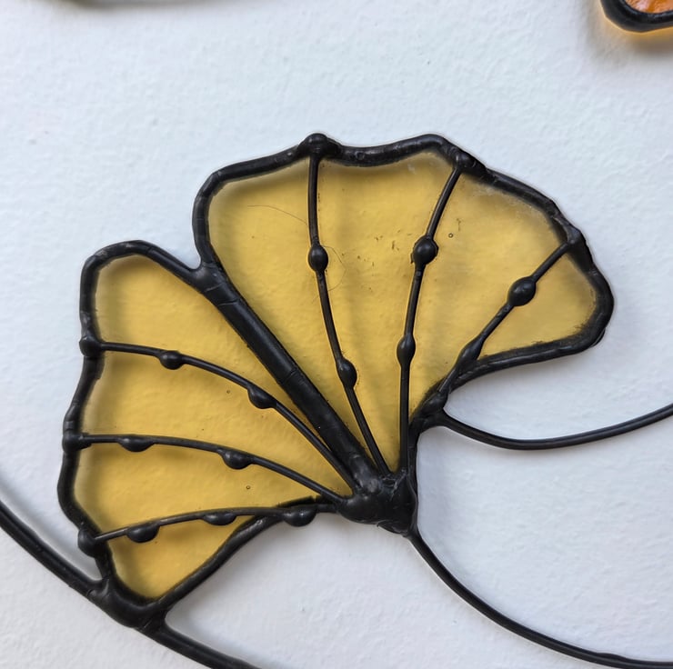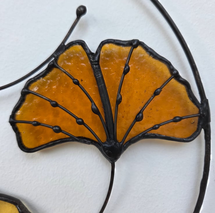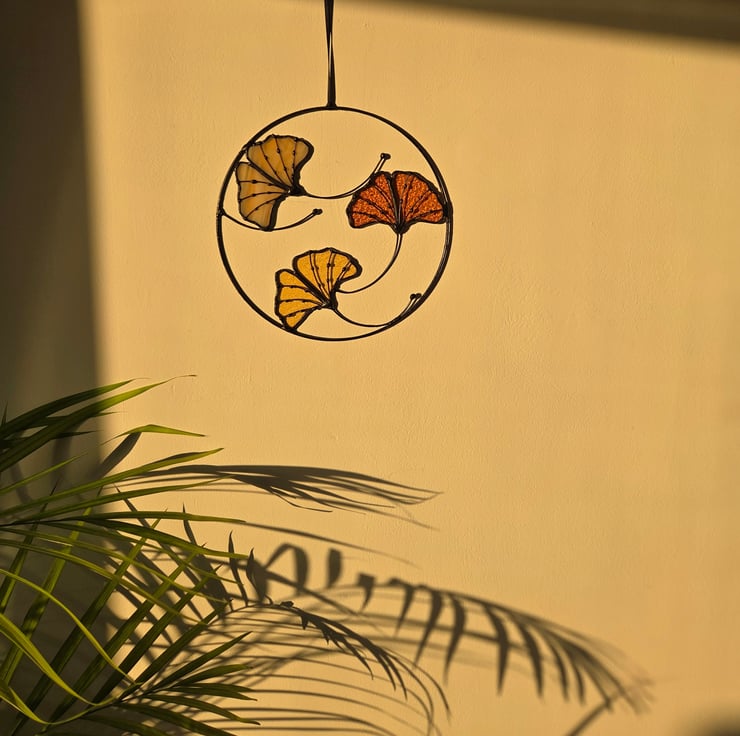 Bring a little calm, nature-inspired beauty into your space with this lovely stained glass ginkgo leaf wall hanging. Three delicate ginkgo leaves in soft shades of gold and amber are set inside a circular frame, with graceful curling stems that give the piece a gentle, flowing feel.