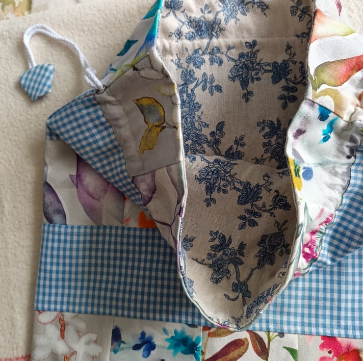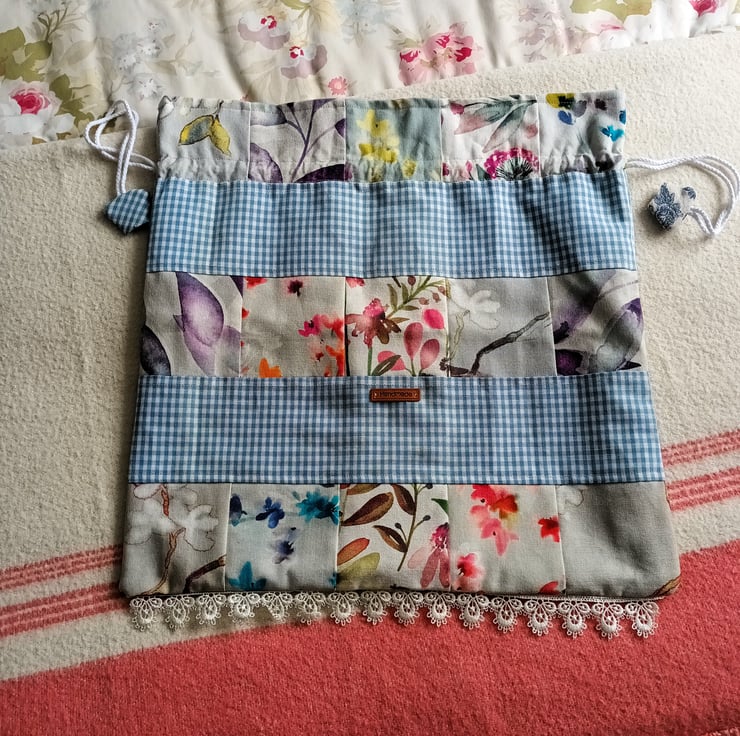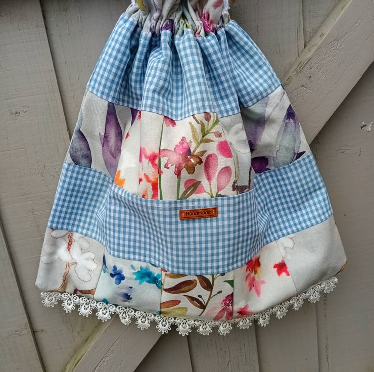 Lovely lined patchwork drawstring bag made from beautiful flowers and gingham print fabric and trimmed off with some lovely lace at the bottom of bag. So many ways to use this bag, travel bag, undies bag, Mothers Day gift idea etc.