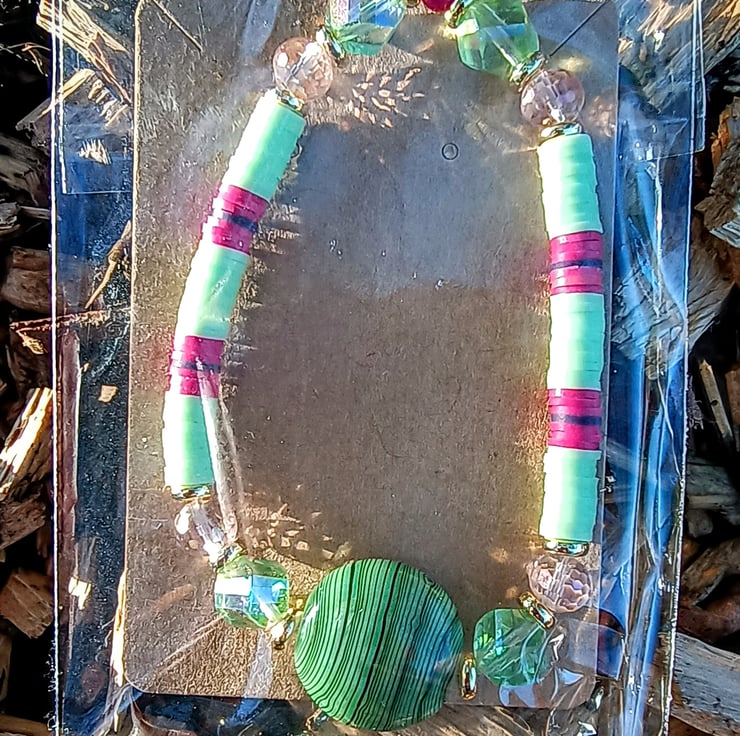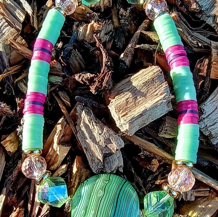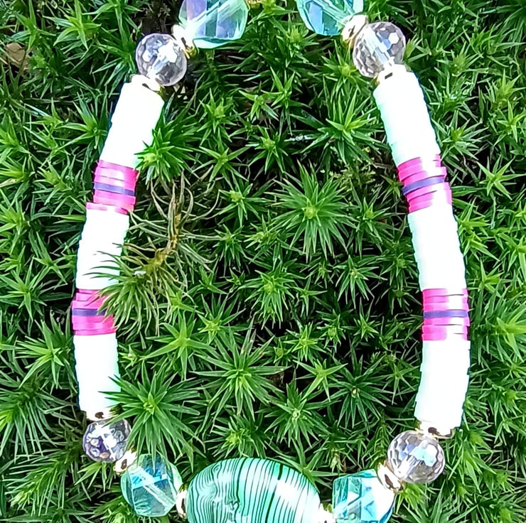 This listing is for "Lily Pad" - A single, one-off, stretchy, fashion bracelet made using mint green, rose pink and deep purple tones of clay polymer beads, a large striped central "sweetie" bead in mint green and black, embellished with several sparkly ice green and ice pink clear beads and a small bright pink bead.