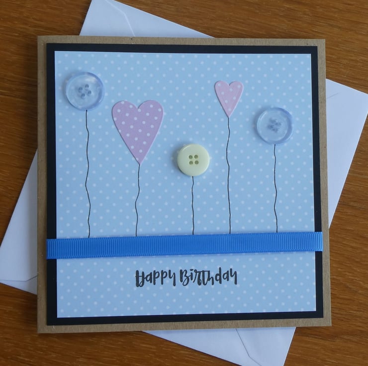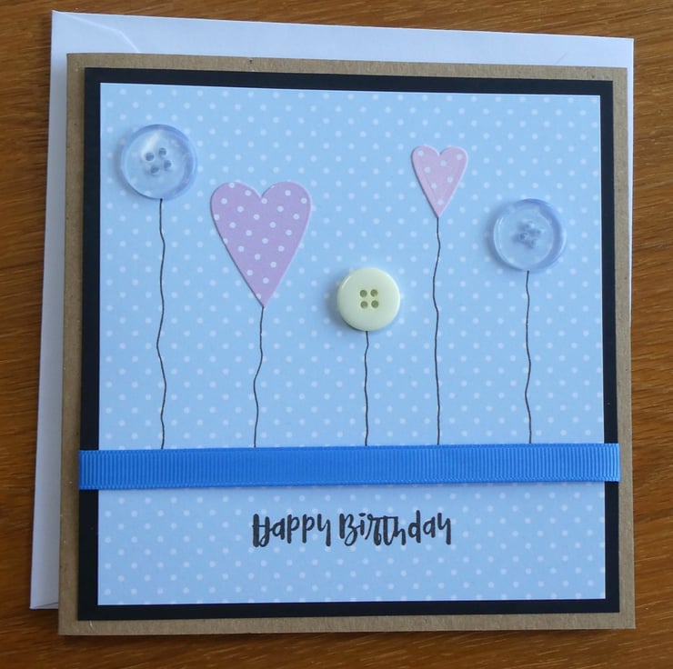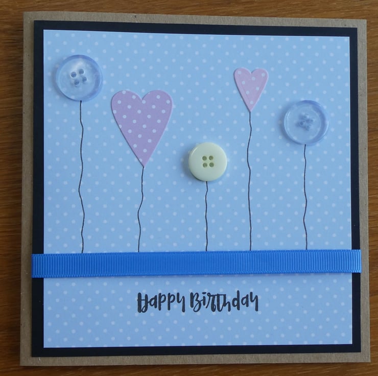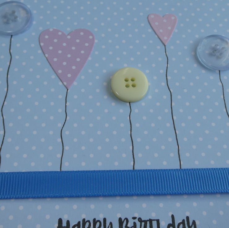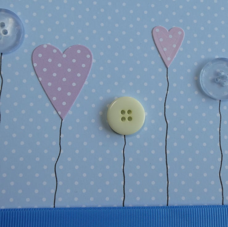 This birthday card with a row of hearts, button flowers and a blue ribbon is perfect to send to a special someone on their birthday.