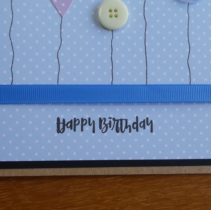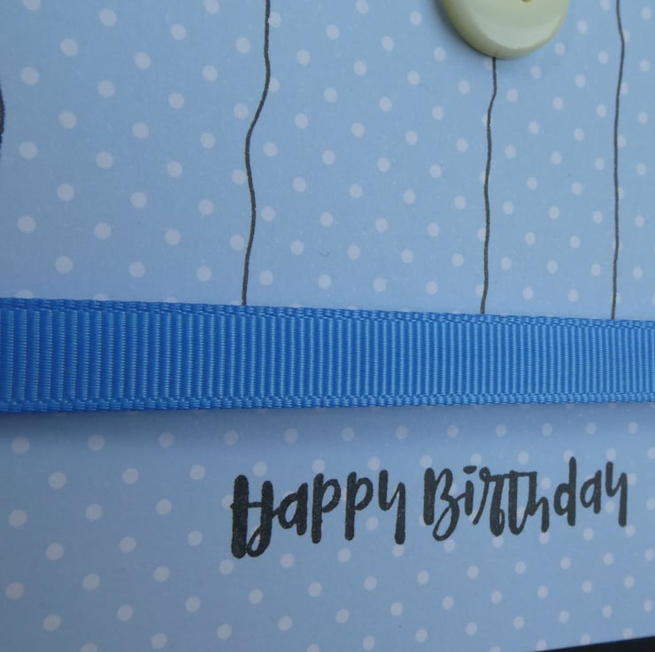 A band of blue grosgrain ribbon has been wrapped around and the message Happy Birthday has been stamped in black archival ink to complete the design.