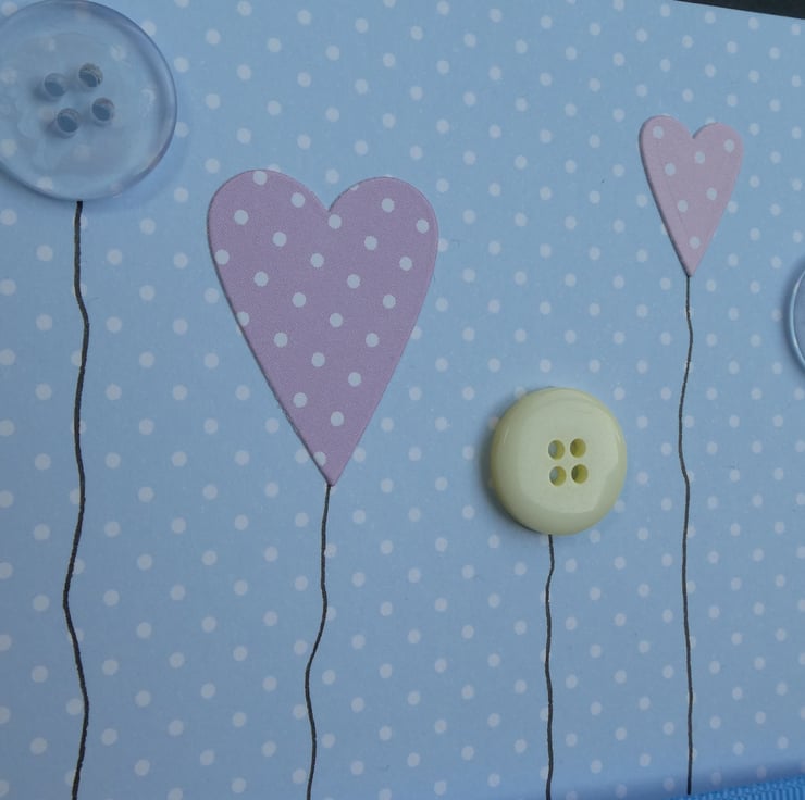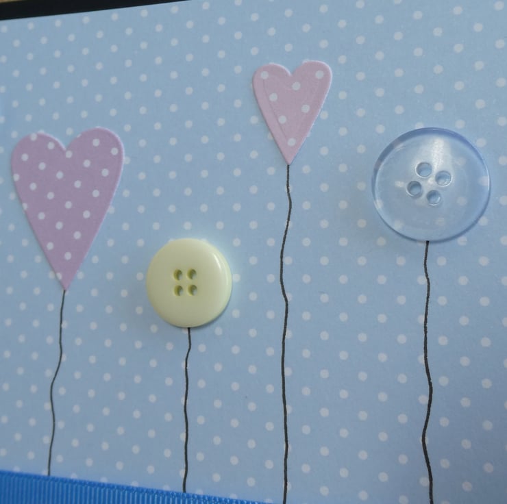A row of three round buttons in blue and lemon and two polka dot hearts have been arranged at different heights on a pastel blue and white polka dot card backround.