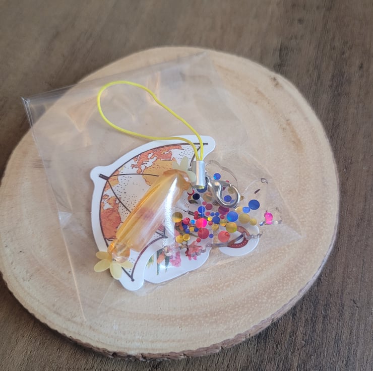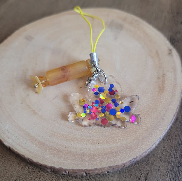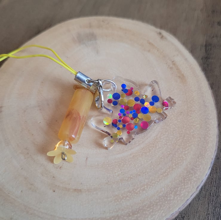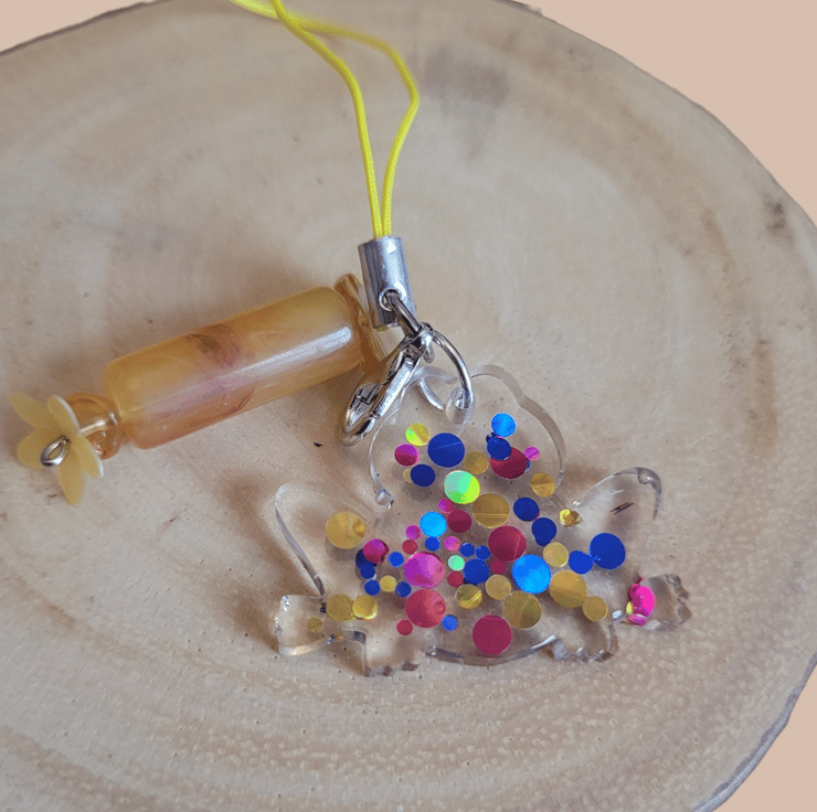 Made with broken jewellery, glitter, sequins, resin, stainless steel jump rings/pins.