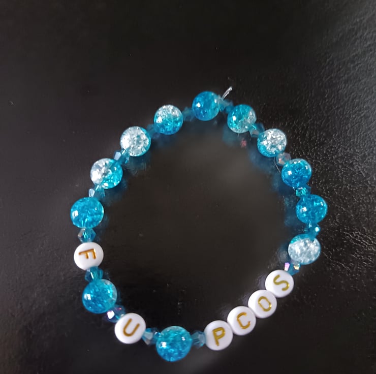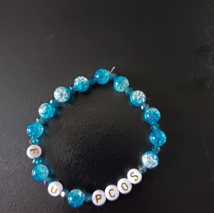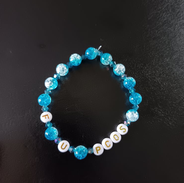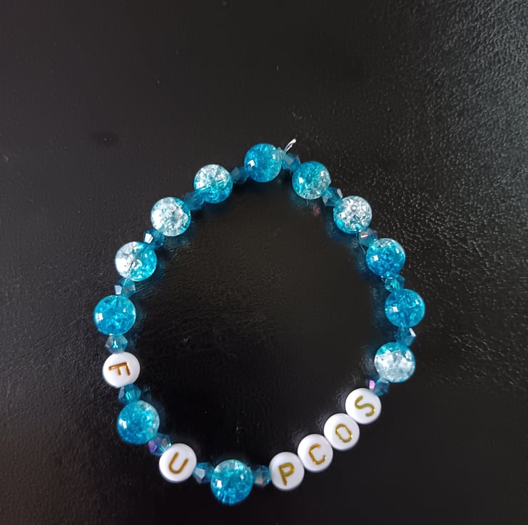 This handmade bracelet is crafted with white and gold letter beads spelling "F U PCOS", turquoise crackle glass beads and smaller blue glass beads. Measuring approximately 7 inches, this is a playful and empowering piece as part of my women's health range, for those suffering with PCOS (poly-cystic ovary syndrome).
