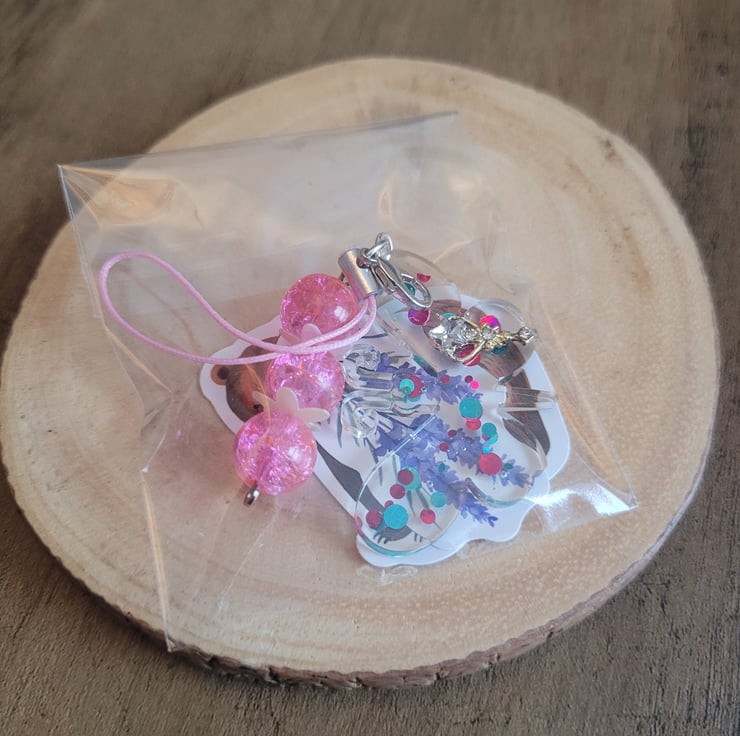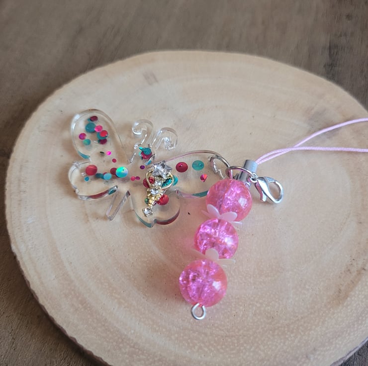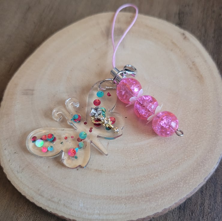Made with broken jewellery, glitter, sequins, resin, stainless steel jump rings/pins.
