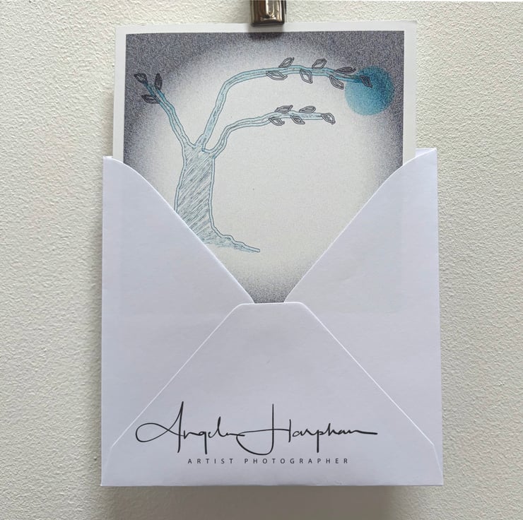 Square blank art card with one of my own digital iPad graphic drawings of a tree, titled 'sheltering tree'. It is one of a series, this one with white frosty leaves is called winter, and is blank inside. It has an envelope and is cello wrapped