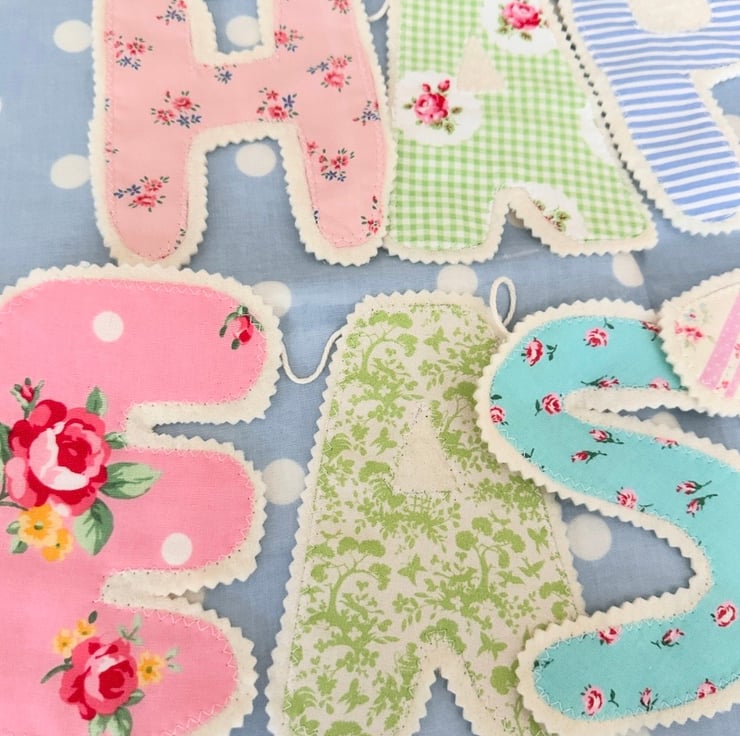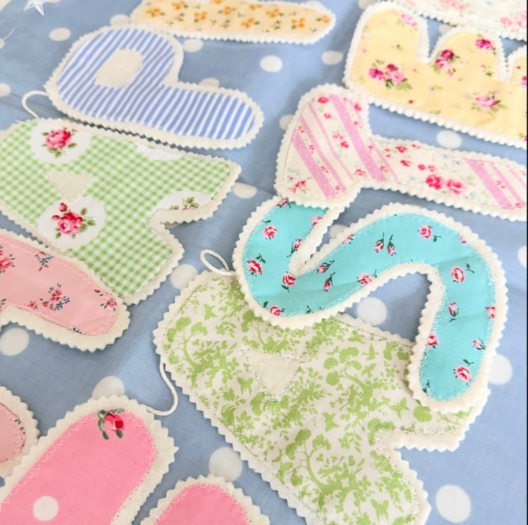 Happy Easter bunting made with these pretty fabrics with wooden backing. Each letter is roughly 16 cm tall .