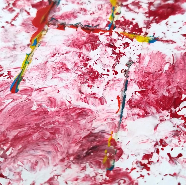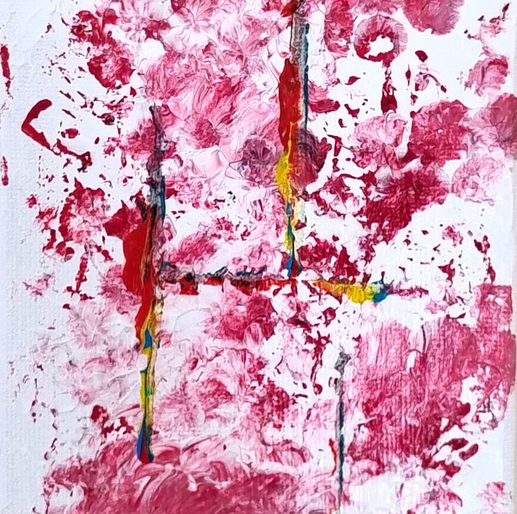 This original abstract painting is a vibrant exploration of colour and form on a compact canvas. Set against a clean, white textured background, the piece features a flurry of expressive pink and magenta tones that evoke the feeling of petals in the wind or cellular structures.