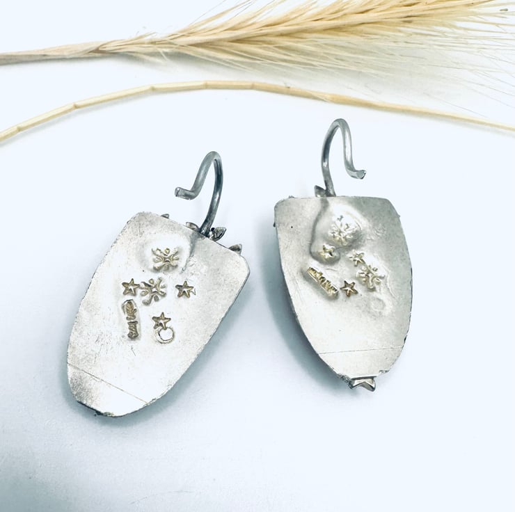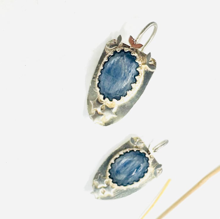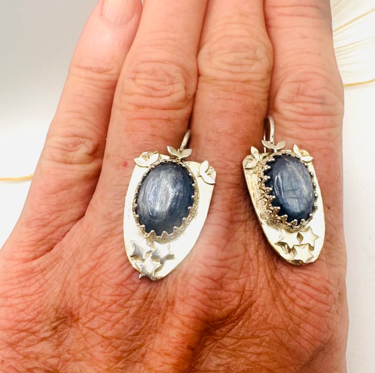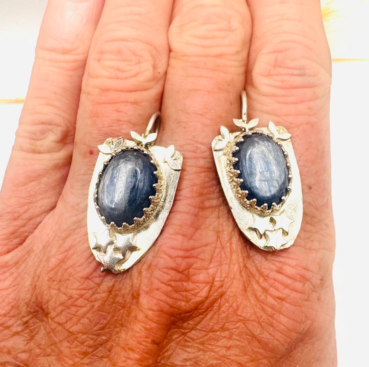 The Wild Sky Earrings celebrate the meeting of earth, sky, and wandering spirit. At the centre rests kyanite, a striking blue stone long associated with clarity, alignment, and inner truth. In folklore and crystal traditions, kyanite has been valued for its ability to restore balance and encourage honest expression, helping the mind and heart move in harmony. Its deep sky-blue colour echoes wide horizons and open air, while the shield shape symbolises protection and strength. Accented with natural motifs, these earrings reflect the untamed beauty of the landscape, representing freedom, resilience, and the courage to walk your own path beneath an endless sky.