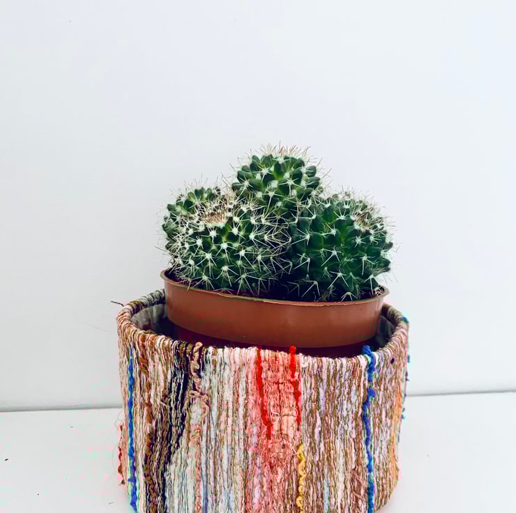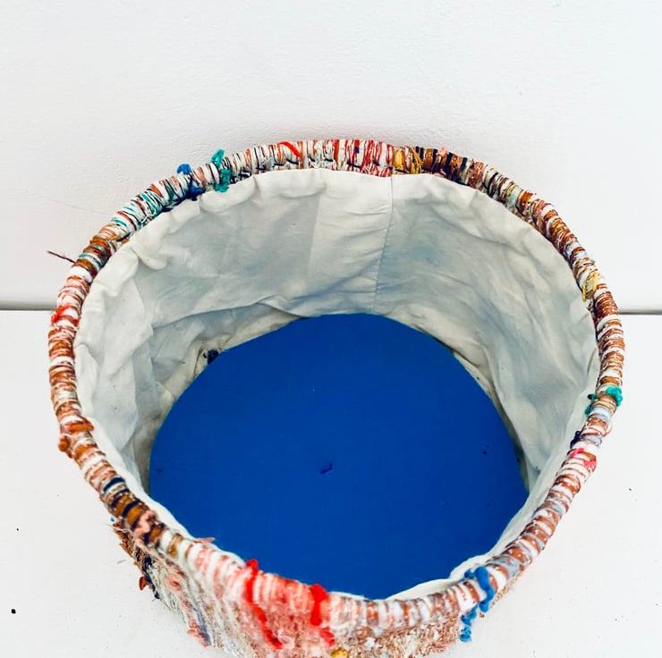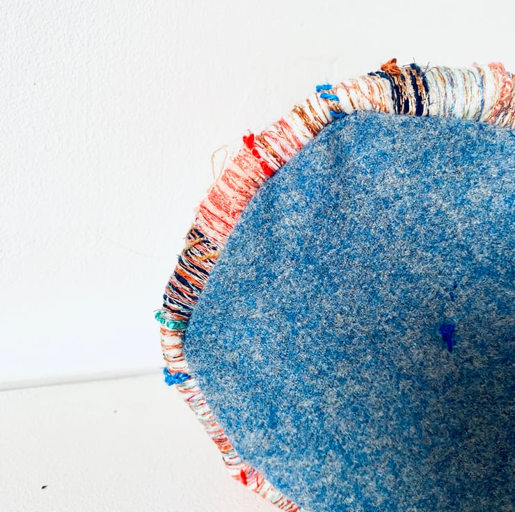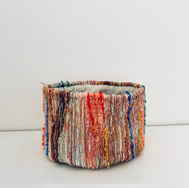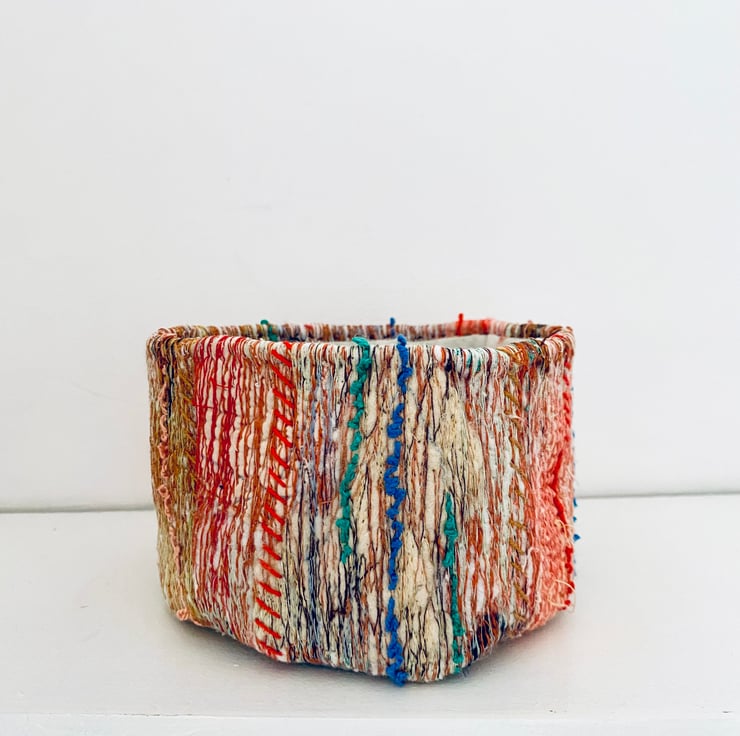 A unique and decorative pot. Made with a mix of preloved fabrics, this colourful textile vessel has been hand and machine embellished.
