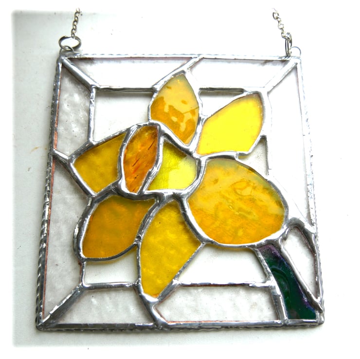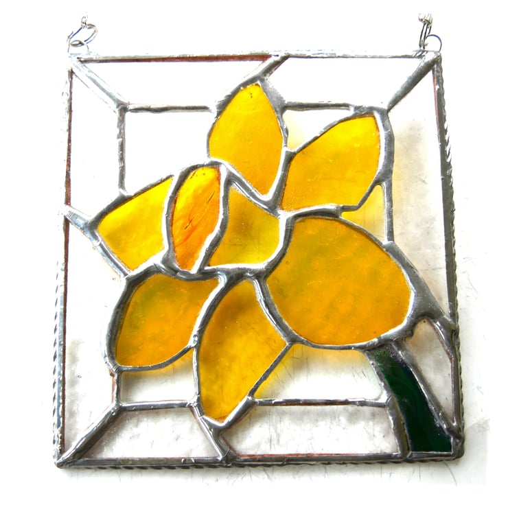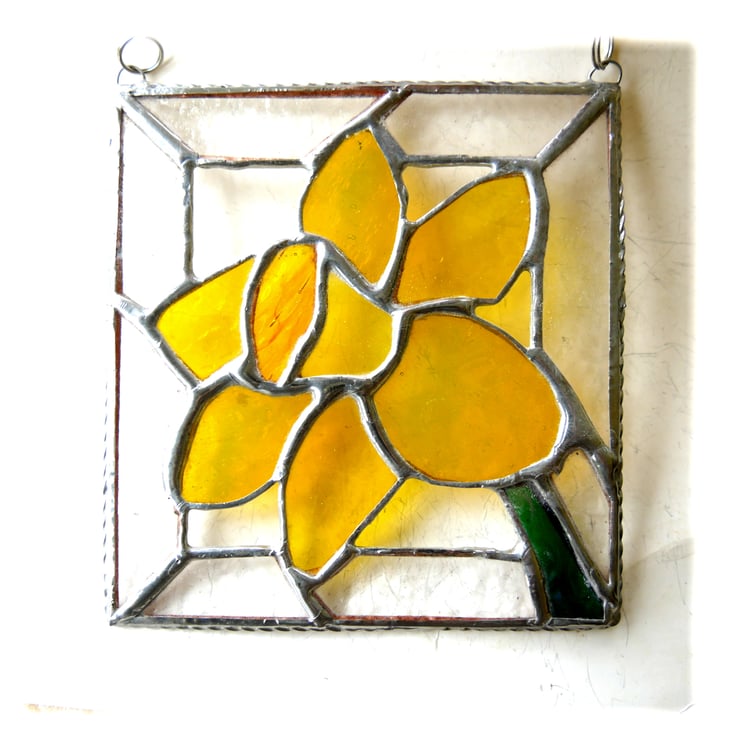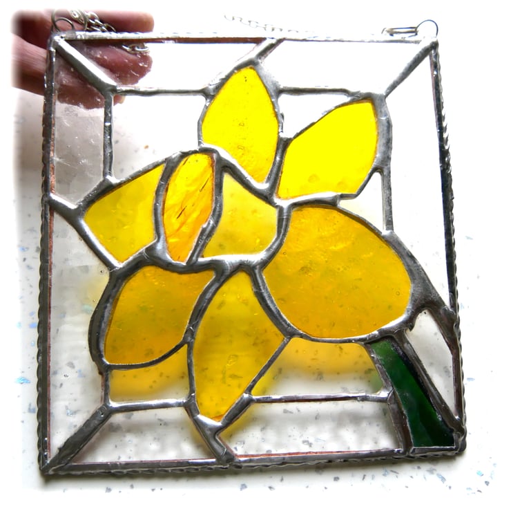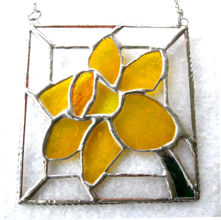 The petals and trumpet in the middle are from 4 different types and textures of bright yellow glass. The streaks in the glass and different shades and textures gives it all movement especially when it catches the light.