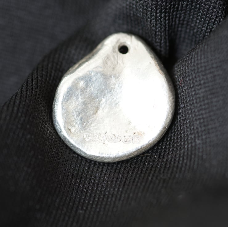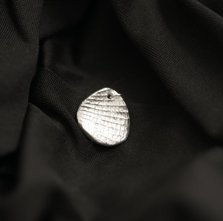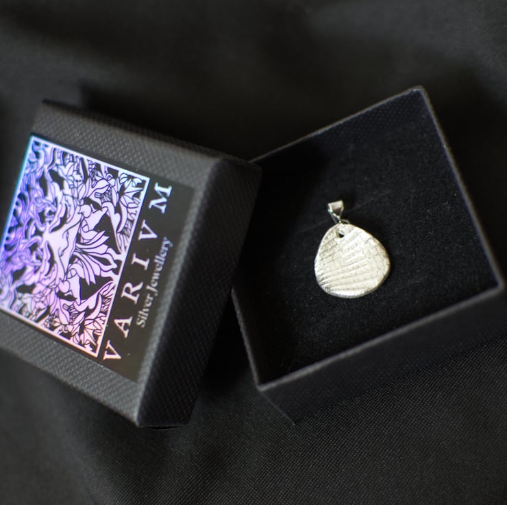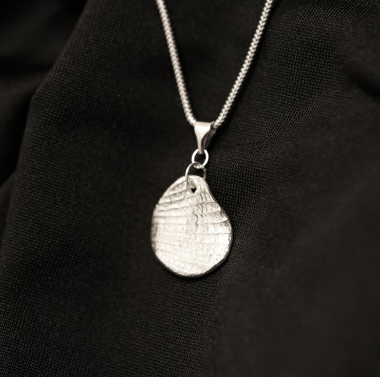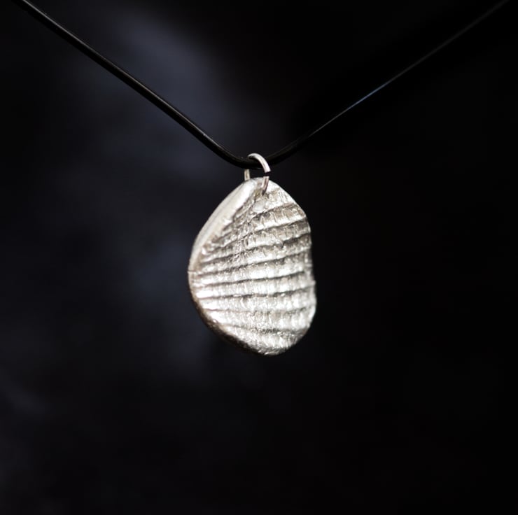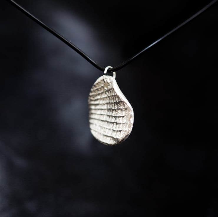This pendant is created from the direct imprint of a real shell, preserving the natural ridges, growth lines and irregular structure of the original form. The piece is handmade in silver and hand finished to keep the crisp surface detail produced by the shell itself rather than a manufactured pattern.