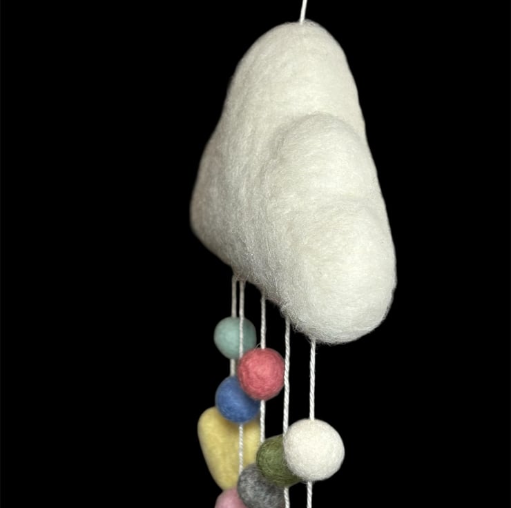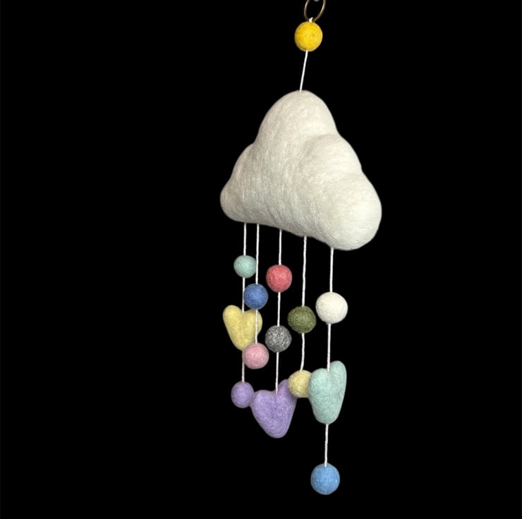 This large fluffy white felt cloud has been designed in pastel shades. A lovely nursery decoration hung on the wall or from the ceiling allowing it to spin in the breeze. The felt cloud made from wool felt, is lightly padded to create a three dimensional shape, approximately 3cm thick. Multicoloured felt balls and three felt hearts in pastel shades have been strung on cotton thread and are suspended below the cloud. At the top a small brass ring has been added to facilitate hanging. A perfect gift for a new baby or baby shower.