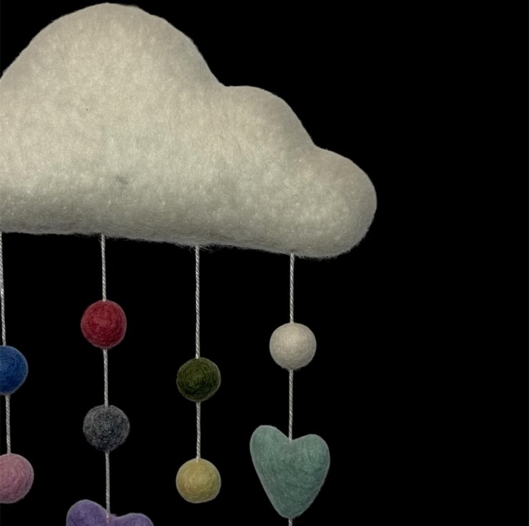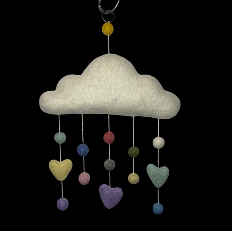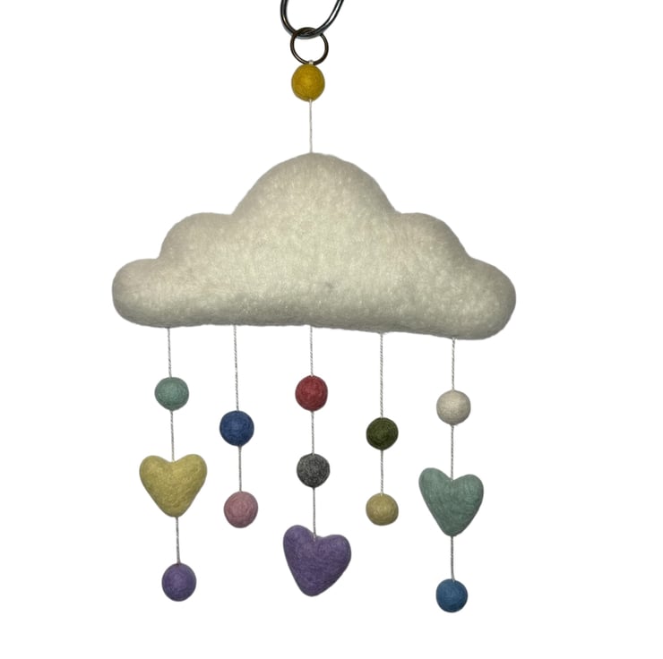 The cloud measures approximately 20cm wide x 9cm tall. The felt balls are approximately 1.5cm in diameter and the hearts measure approximately 25-30mm in width. The total height of the decoration as a whole is 29cm.
