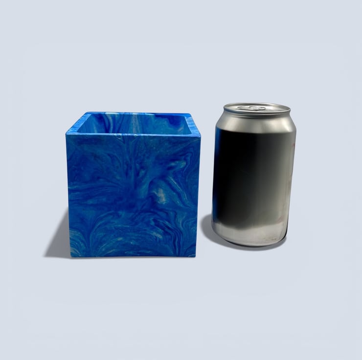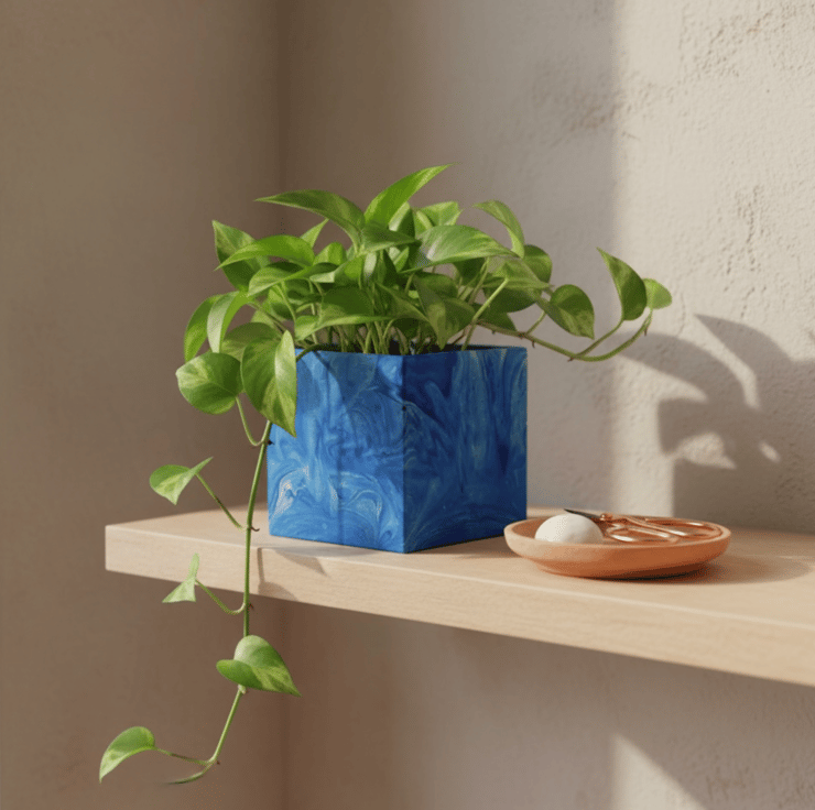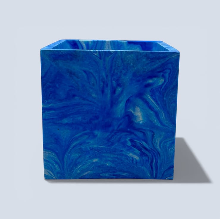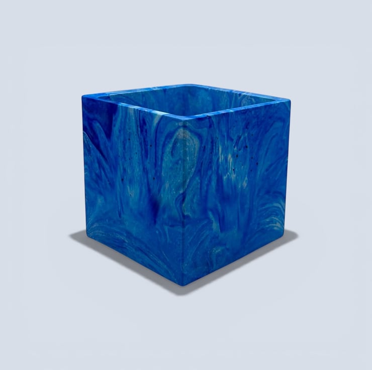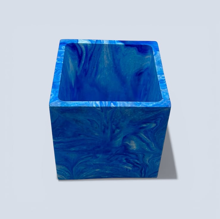 I wanted the clean square shape to contrast with the flowing marbled pattern, combining strong modern geometry with softer natural movement. This balance between structure and fluidity gives the pot a bold yet calming presence when paired with trailing or leafy houseplants.