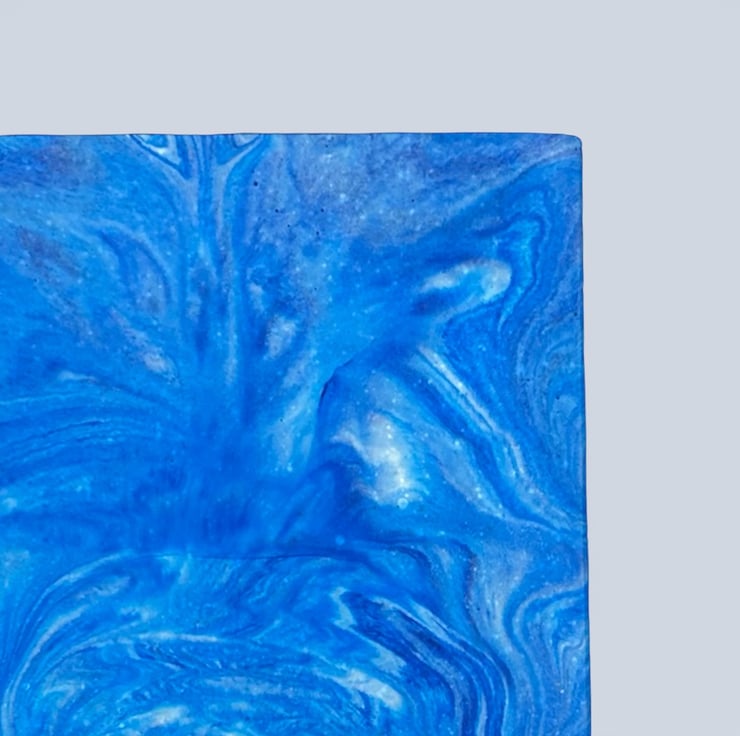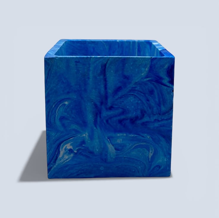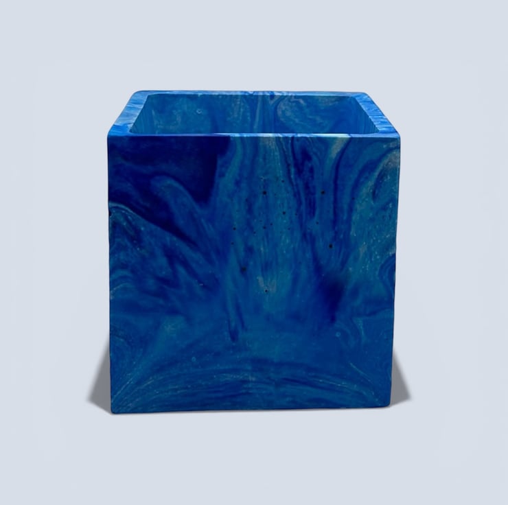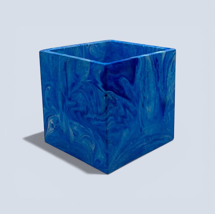10 cm square blue marbled plant pot for indoor houseplants, succulents and herbs. This planter features layered swirls of deep cobalt, sapphire and lighter ocean blues flowing through the surface. The marbling creates natural depth and movement across each side of the pot, with subtle lighter streaks and soft colour blending that make every angle slightly different. The rich blue tones contrast with green foliage, making it a lovely gift for plant lovers, housewarmings or birthdays, or a stylish accent for shelves, desks or windowsills. The clean square shape gives the design a modern architectural feel, while the flowing marbled pattern keeps it organic and expressive.
