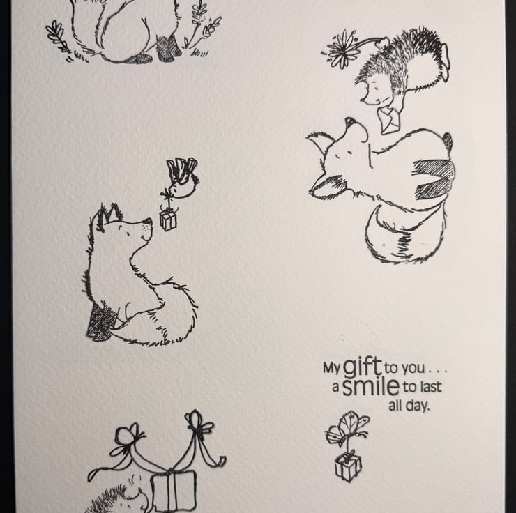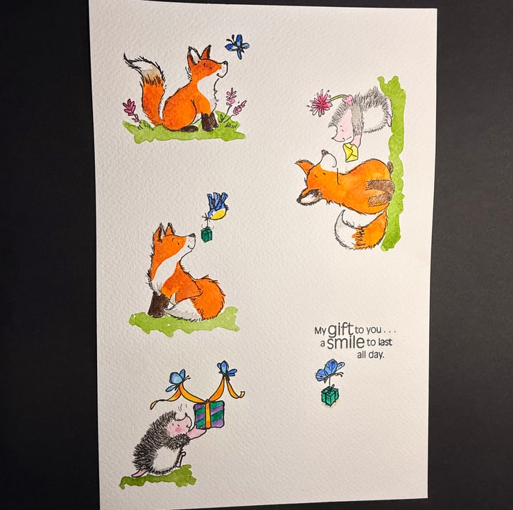 An A4 sheet of hand stamped woodland illustrations, created using Penny Black stamps on thick, lightly textured watercolour paper.