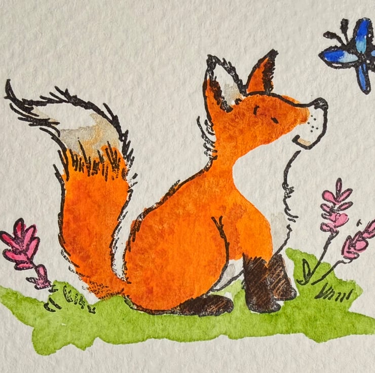 1. A fox nestled among flowers, almost in conversation with a blue butterfly.
