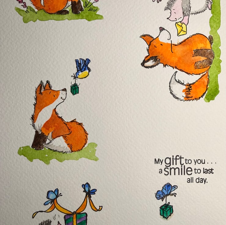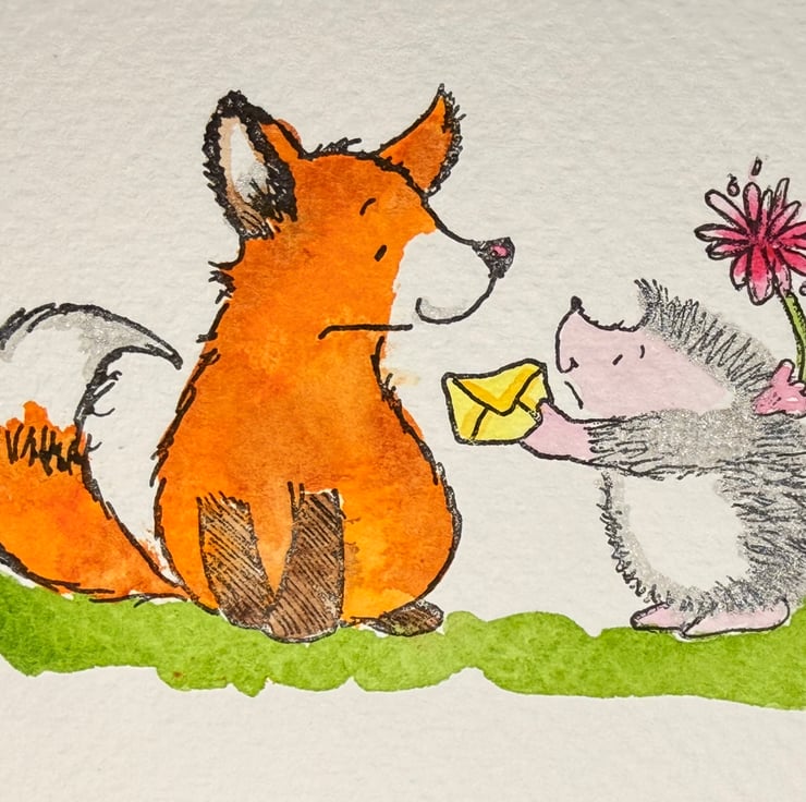 These woodland scenes were inspired by the quiet kindness found in nature — the way small creatures seem to share moments of curiosity, generosity, and friendship. I wanted each illustration to feel like a tiny story: a fox pausing to greet a butterfly, a bird delivering a thoughtful gift, a hedgehog bringing news in a letter, and a joyful dash of celebration with butterflies lifting a present skyward.
