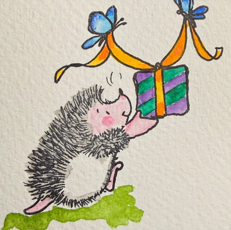 4. A joyful bonus illustration: a hedgehog running with a gift held high, while butterflies flutter above, lifting the ribbons.