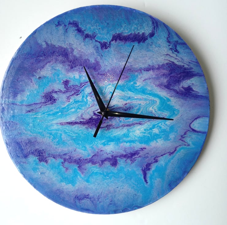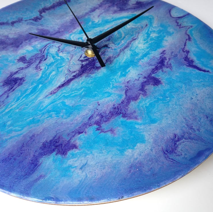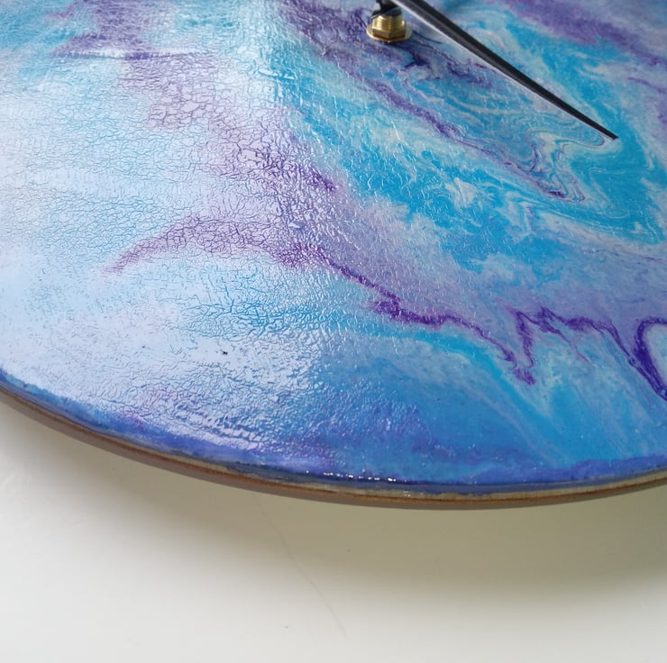 Abstract design on a wooden circle using acrylic paint. Fluid art.
