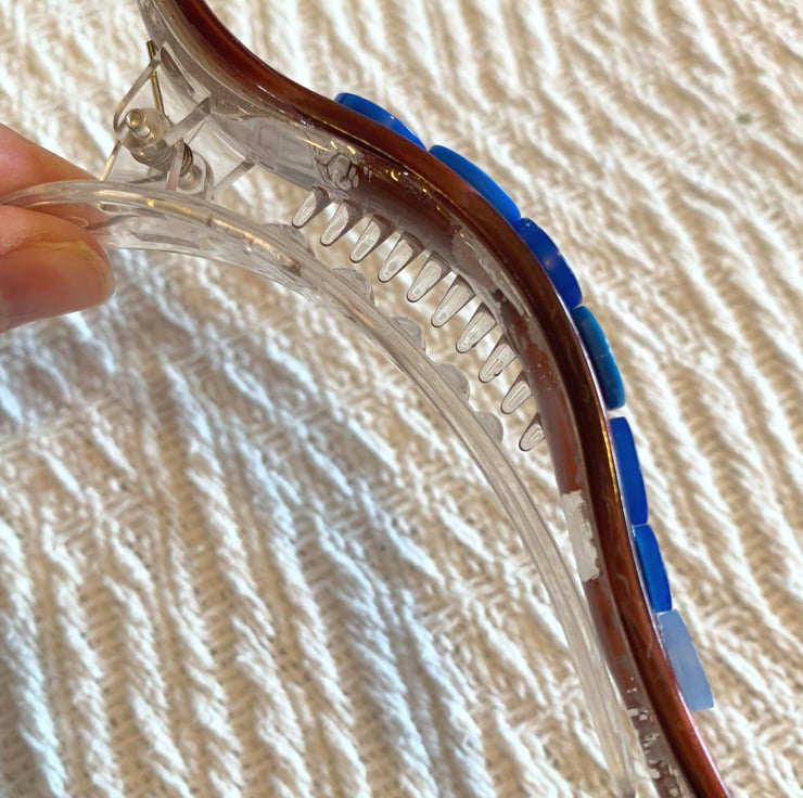 Standard curved Banana clip with teeth and a hinge at one end, adorned with many shades of blue buttons along the length.