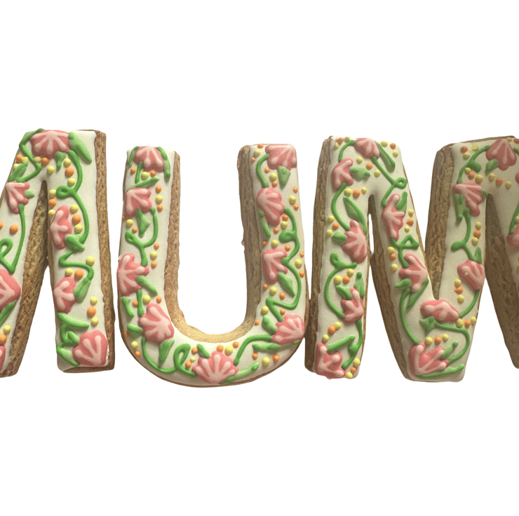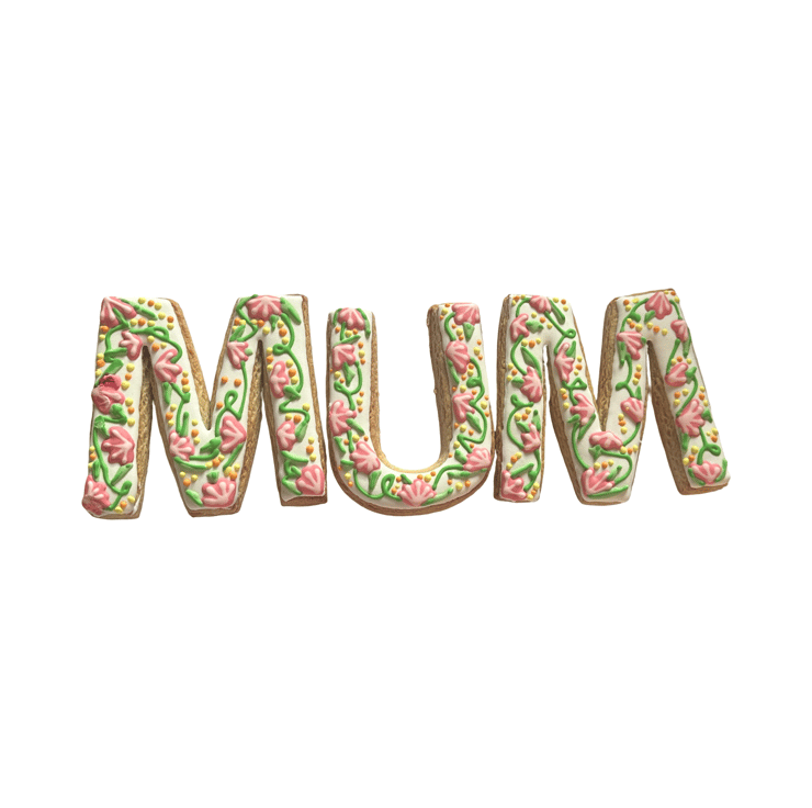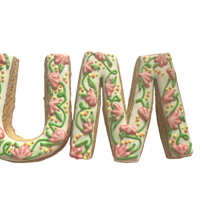 A set of three hand-decorated sugar cookies spelling MUM, each one lovingly piped with a trailing floral vine design in soft pink, green, and golden yellow on a white iced base. Every letter is hand-cut from scratch and decorated individually, so each set has its own unique character.