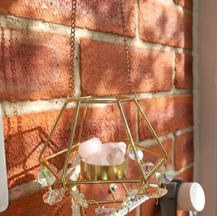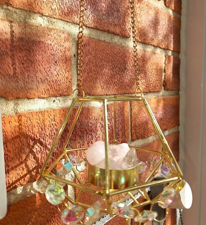 This suncatcher is made from a hexagonal golden wire with four natural crystals in the middle, two being Rose quartz and the others are normal quartz.