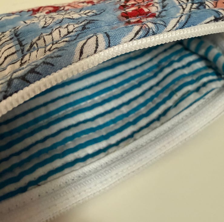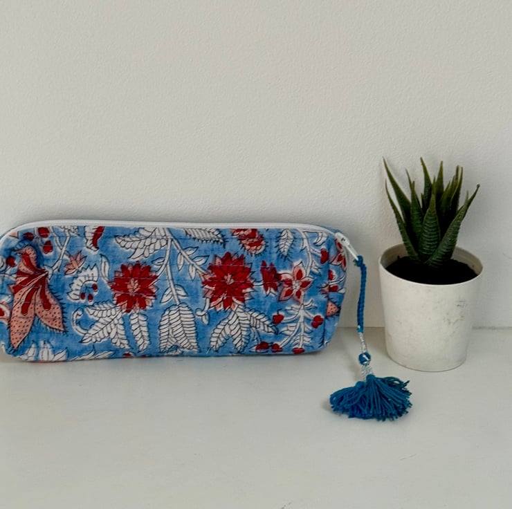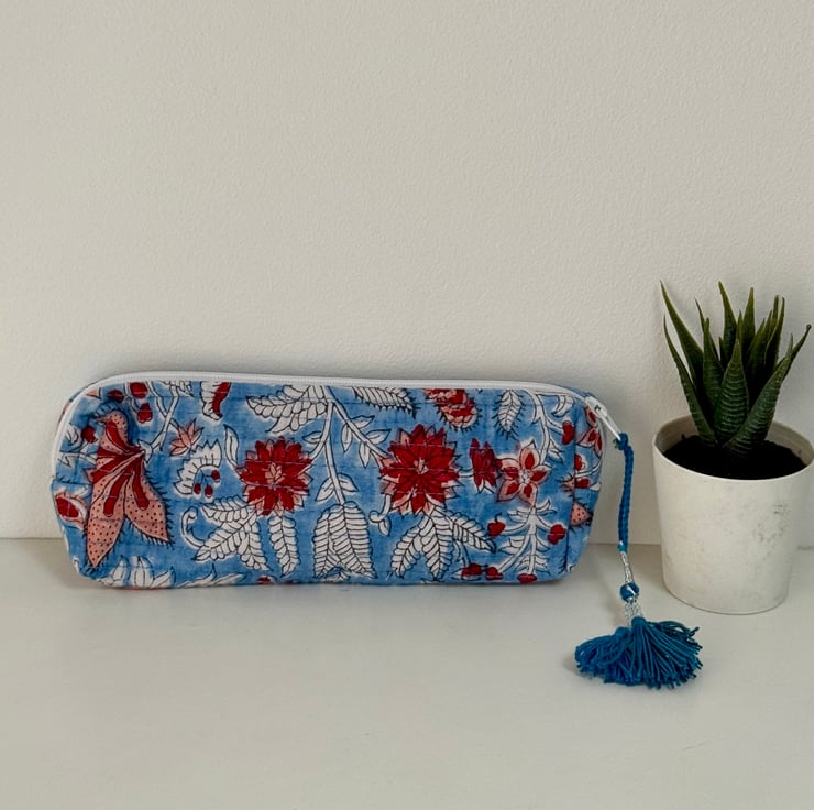 Handmade quilted cotton pencil case or sleek makeup bag with a vibrant floral print.